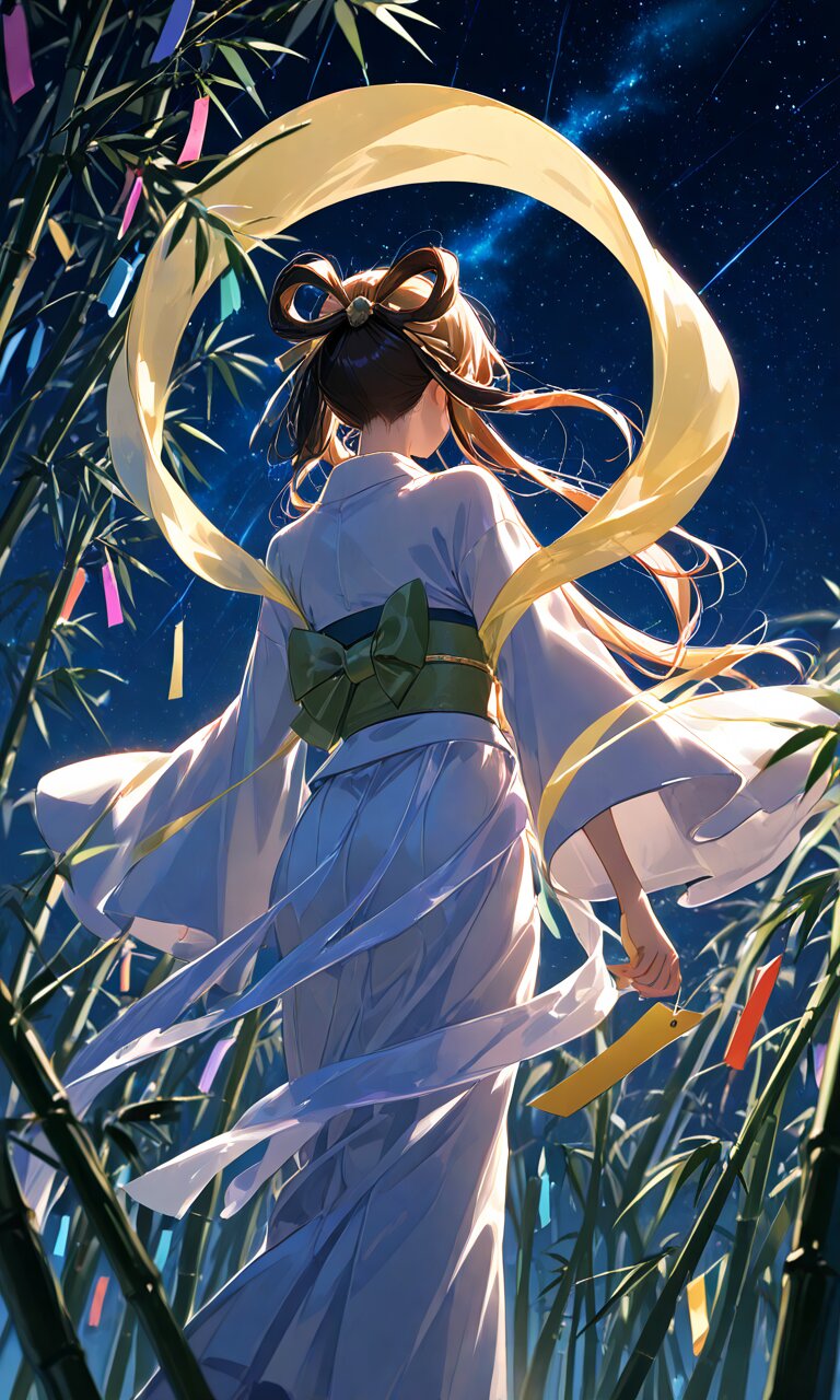 orihime,, hair rings, hair ornament, shawl, japanese clothes, tanabata, hagoromo, long sleeves, wide sleeves, sash, kimono, star (sky), night,bamboo,tanzaku