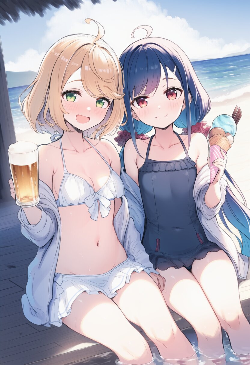 masterpiece,best quality,ultra detailed,2girl,girl,short stature,medium breasts,slender,green eyes,blonde hair,medium hair,{{straight hair}},asymmetry bangs, swept bangs,ahoge,white bikini,Drunk man holding a beer glass,Sandy beach, beautiful sea,blue sky, very aesthetic,girl,short stature,flat chest,red eyes,{{cobalt Blue hair}},{pigtails},very long hair,{{low twintails}},{{{extra long sideburns}}},black swimsuit,Have ice cream,smile