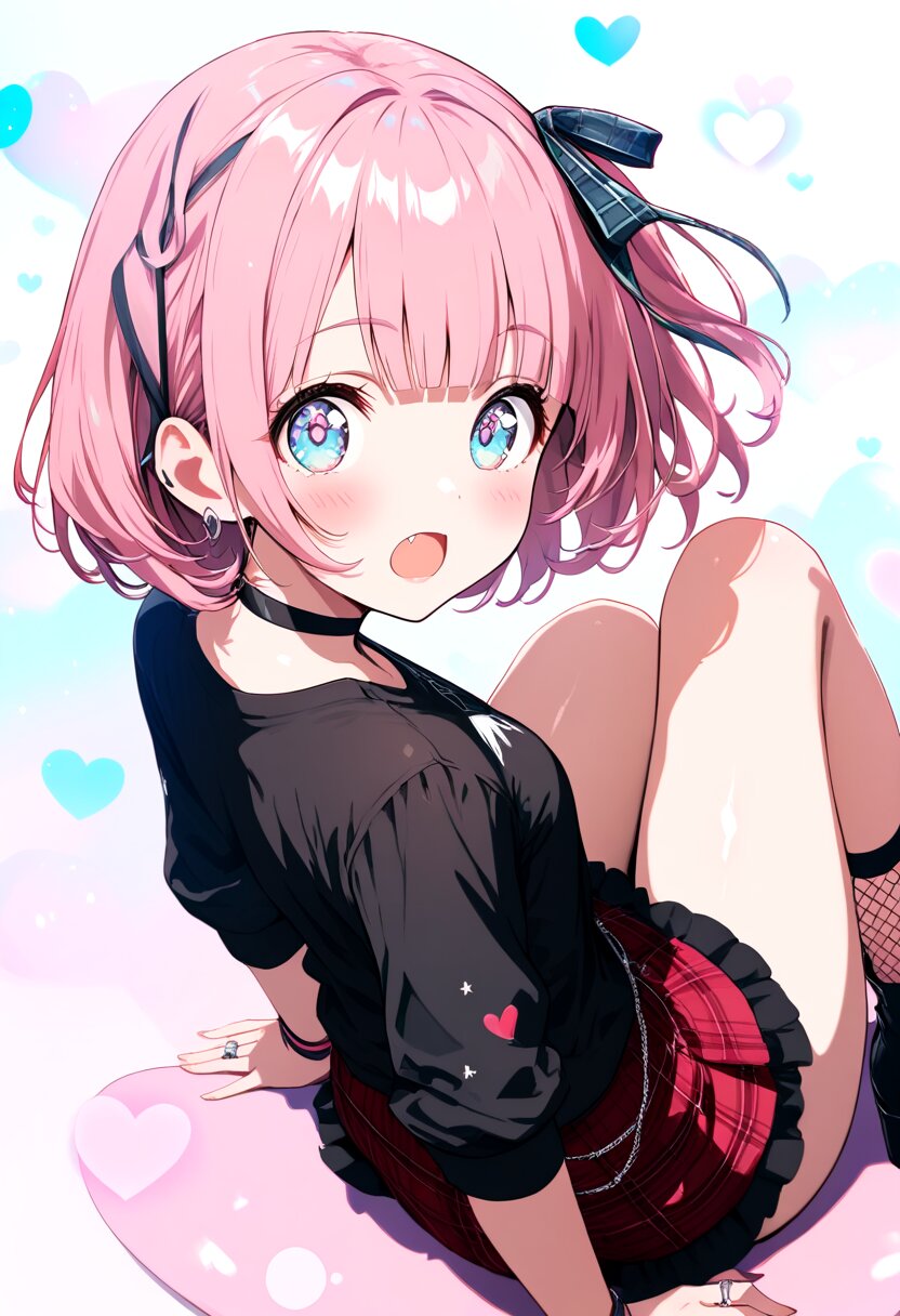 1girl, petite, punk, pink hair, medium straight hair, bob cut, blunt bangs, blue thin string hair ribbon, stud single earring, big round anime eyes, tareme:1.4, dark blue eyes, feature double highlights, looking back, beautiful lips, pink lips, glossy lips, fang, open mouth, surprised, blush:1.4, oversized black summer top untucked, sleeves past elbows, sleeves heart-shaped cutout, choker, medium breasts, asymmetrical multiple layered miniskirt with red plaid pattern, waist chain, fishnet socks, (thighs ring, ) short boots, sitting, leaning back, one knee up, plantar flexion, from behind, back shot, from above, cute background, heart effects, bokeh:1.4, Dreamy Blur, light particles,
