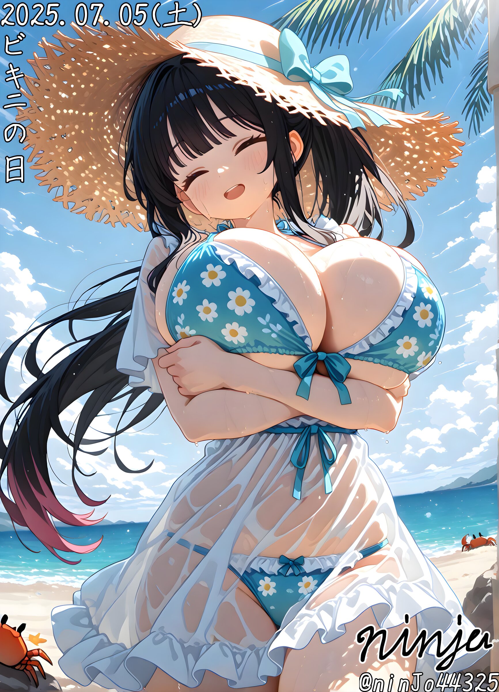 1girl,solo,short female,firm skin,(curvy),loli,(gigantic breasts),narrow waist,slim,(thick thighs:1.1),(wide hips:1.2),black hair,colored tips,(white tips),long hair,ponytail,=_=,closed eyes,relieved face,light-open mouth,layering,straw hat,blue hat bow,(bikini under clothes:1.1),wet dress,wet clothes,(see-through dress:1.2),white dress,half-sleeved,blue bikini,floral print bikini,bow bikini,huge bikini,bikini visible through clothes,blue panties,bow panties,panties under clothes,wet,skin tight,skindentation,heavy sweat,head tilt,breast hold,arms under breasts,breasts squeezed together,lying on back on shallows,walking a crab,shells,partially submerged,sunbeam,looking at viewer,breast focus,from front,cowboy shot,shallows background,seaside background,sidelighting,cinematic lighting,beautifully lit,light rays,foreshortening,perspective,(soft shade:1.4),(high contrast:1.2),(stylized),(kawaii),(cute),masterpiece,flat color style, simple coloring style,gddw,((correct_anatomy)),cute pastel colors, soft pastel colors,