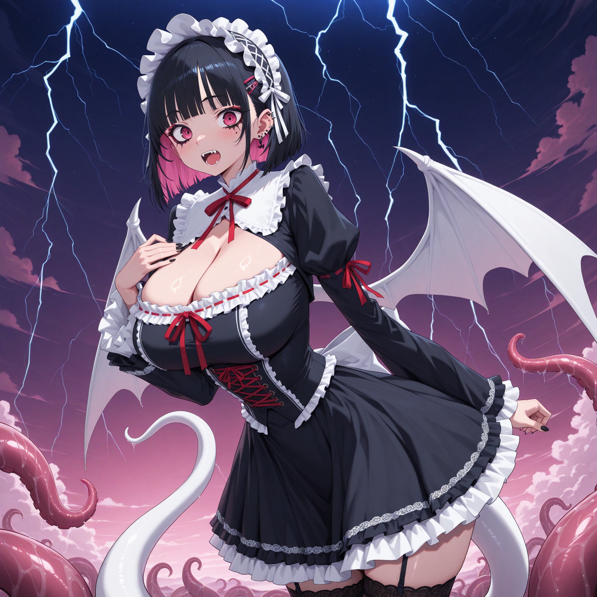 (1girl), young female, BREAK,Mineral makeup, (makeup), (heavy eye shadow), deep makeup , , ((gothic lolita, lolita fashion)) (Sharp eyes), (pink eyes), hime cut, blunt bangs, ((Bob hair:1.3)), ((black hair)), ((pink inner hair:1.2)), many piercings, (pink hair clip) BREAK, slim, small waist, hyper breasts BREAK, Slender, narrow waist, toned body, athletic body, shiny skin, beautiful pupils Black nails, gorgeous nails, nail decorations Gothic lolita, lolita clothes, black dress, white ribbon, red ribbon, black knee-high socks, frills, embroidery Crazy eyes, sharp fangs BREAK, White wings, devil's wings, ((White devil wings:1.3)), ((white tentacles:1.4)), countless tentacles ((Tentacle tail:1.6)) Night, midnight, moonless sky, clouds, lightning BREAK, ((newest, year 2024, anime, animation, anime screen capture, anime style:1.2)) BREAK, ((masterpiece, , vibrant, very aesthetic, highly detailed, best quality, 16k:1.2)) Perfect hands, perfect fingers,