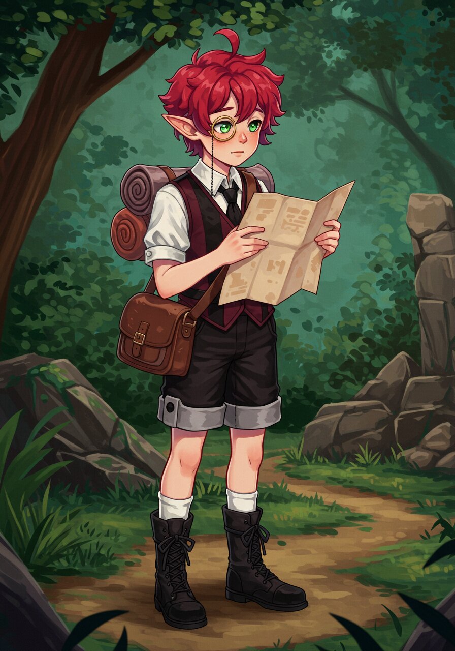 A young, elf-eared boy with fluffy, vibrant red hair styled similarly to Ragatha from "The Amazing Digital Circus". His left eye is covered with a monocle. He has gentle green eyes and a shy, innocent-looking face, now focused and thoughtful as he looks down at a map held in his hands. He wears a short-sleeved white shirt with a black necktie, and a fitted vest with a black front panel and dark red (maroon) side panels. He also wears black shorts with the cuffs rolled up to reveal white lining. His outfit is completed with white socks and sturdy, lace-up black boots suitable for travel. Slung across his shoulder is a worn-looking travel satchel or shoulder bag, slightly bulging as if packed for a journey. He stands in a natural setting—perhaps a forest path, ancient ruins, or a hilltop trail—pausing to study the map with a calm but curious expression. Full body, standing pose. The art style is semi-realistic anime, with soft shading, rich textures for cloth and leather, and subtle environmental storytelling to convey a quiet sense of exploration.