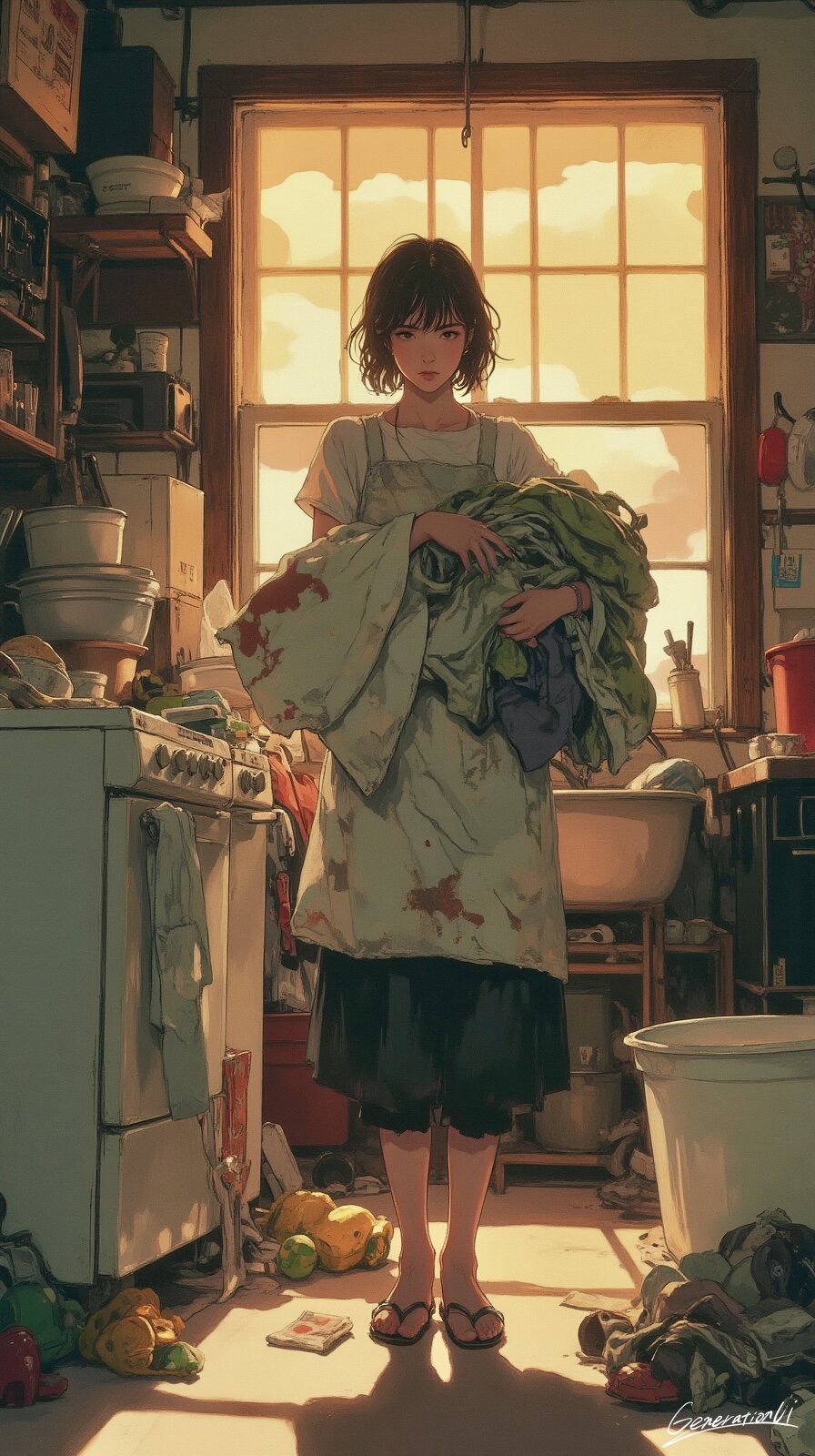 流しに積み重なった皿、脱ぎ捨てられた衣類、床に転がる野菜たち――