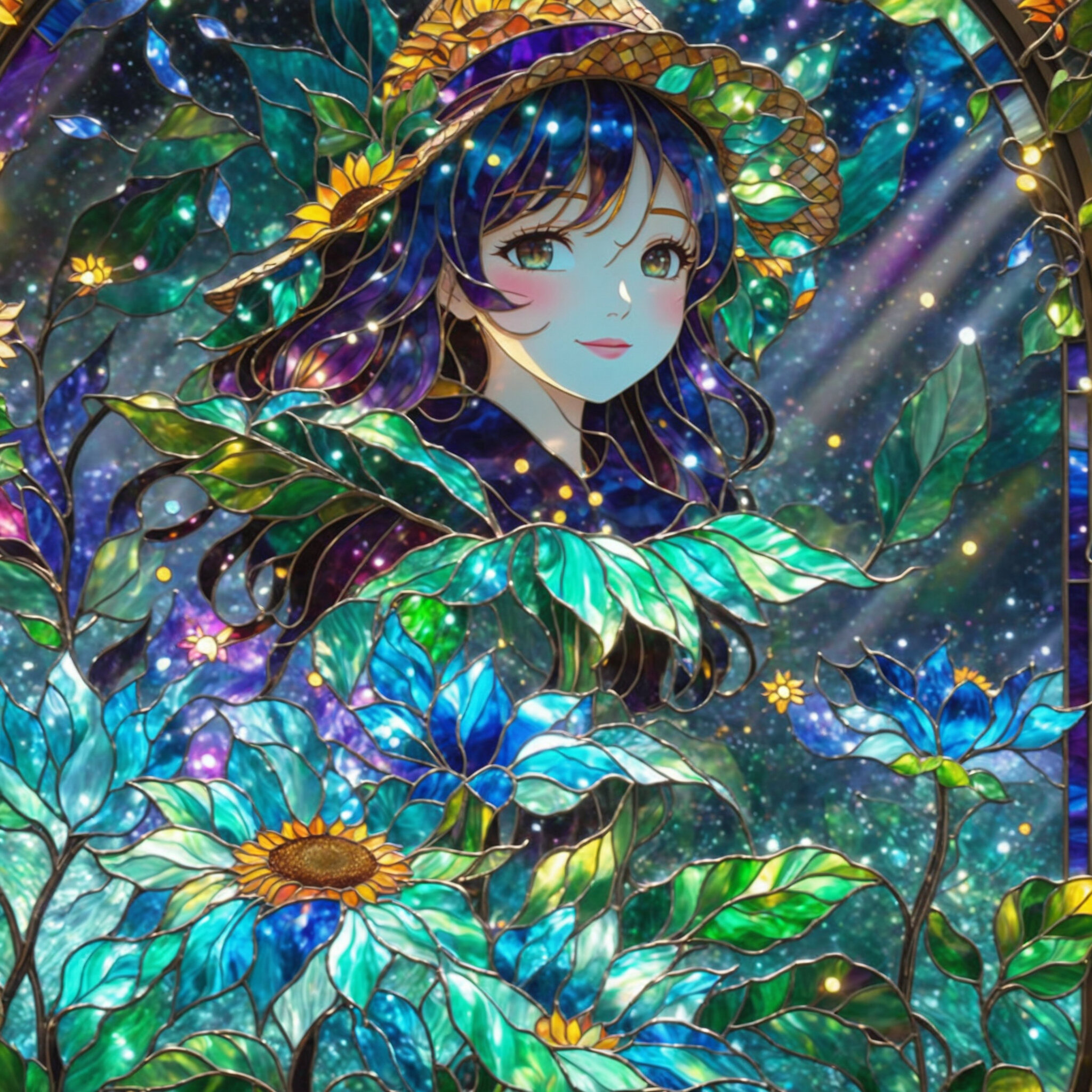 masterpiece, best quality, animation style, anime colored, A vibrant, summer-inspired stained glass artwork featuring a blooming sunflower (weight: 2.2) near the sea, surrounded by colorful fogs and glowing magic particles. Over 20 fireflies dance in the scene, casting soft light particles that enhance the vivid, radiant colors. A straw hat rests gently near the sunflower, adding a summery touch. The composition is bright, uplifting, and awe-inspiring, with intricate stained glass patterns that capture the essence of summer, evoking joy and wonder.