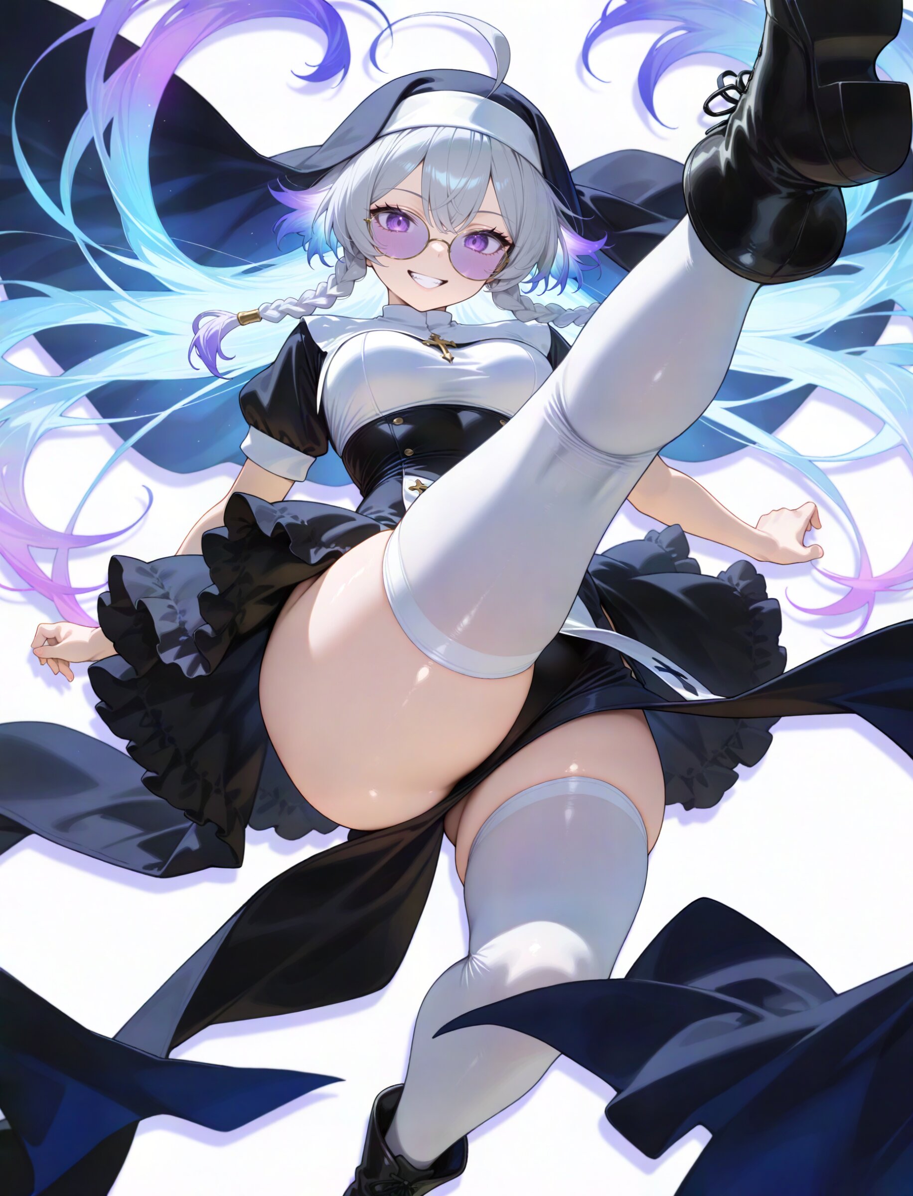 from front (close up:1.3), knees out of frame focus crotch , looking at viewer, (simple white background:1.1), drop shadow, colored shadow, 1girl, nun, beautiful detailed eyes, holy face, cool Elegant and sophisticated demeanor, (redness skin:1.0), skindentation, beautiful indigo eyes, light purple tinted eyewear , silver hair, burnt sienna colored tips, very long hair, side braids nihongami ahoge glowing hair, first-rate female bodies perfect body beautiful framed breasts wide hips, , solo, nun, traditional nun Good texture veil, Mystical Veil, blue laced cape, , black divine laced chasuble, ,short sleeves, the feel of glossy, , , , , , cool long skirt, frilled skirt, light grey high-waist thighhighs under skirt, ankle boots, shiny smile, (toothy grin:1.0), , super fine concept art, hard surface, graceful eyes, masterpiece, best quality, amazing quality, very aesthetic, absurdres, newest, professional art lots of details, , overexposure, shiny-glistening, (watercolor style:0.5), (pastel color style:0.5) <lora:noline (1):-0.5> <lora:sdxl2-flat2-512b:0.0> <lora:facelightup_xl_v10:0.5>