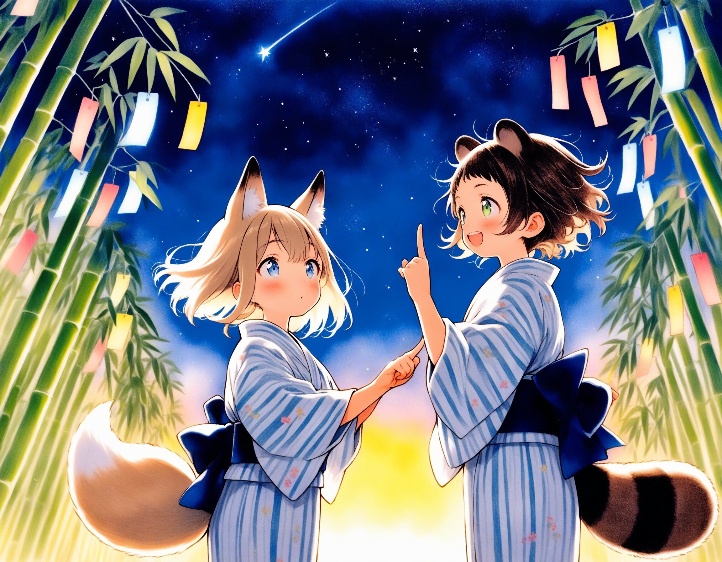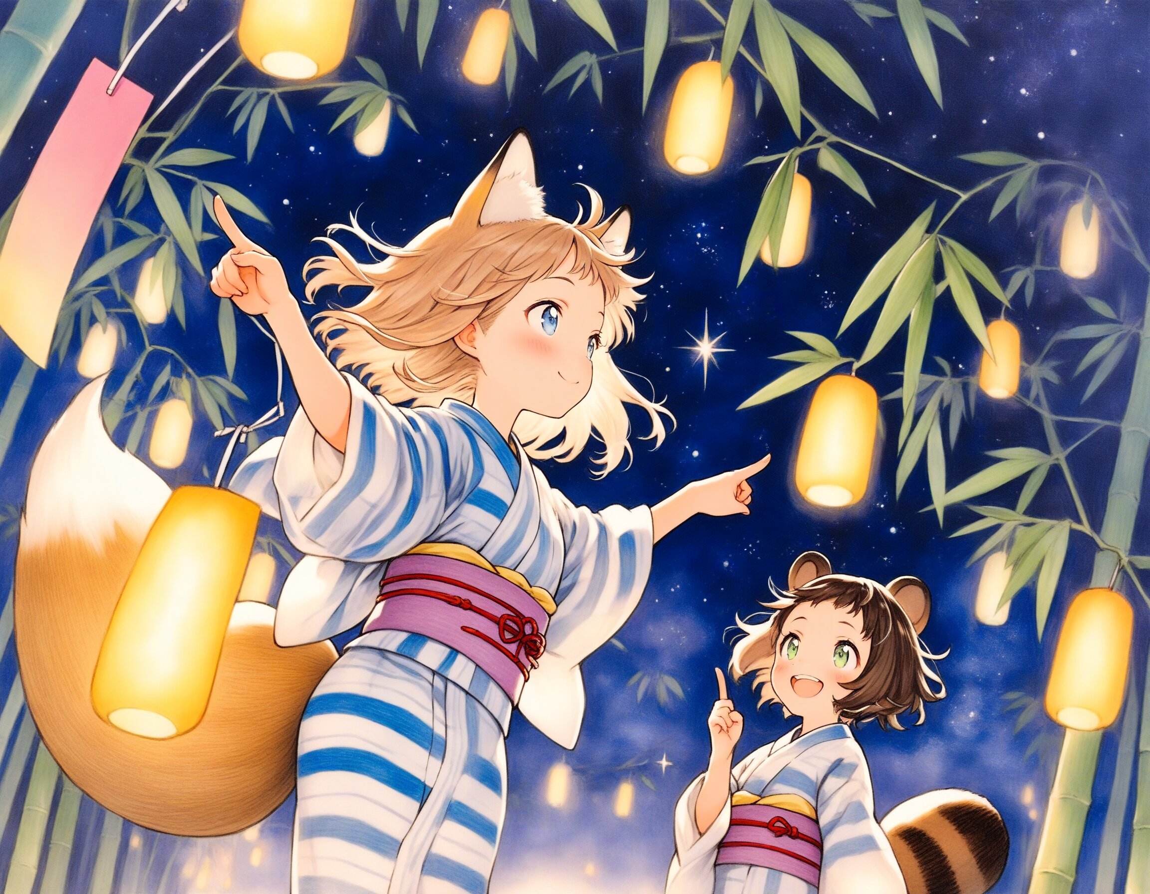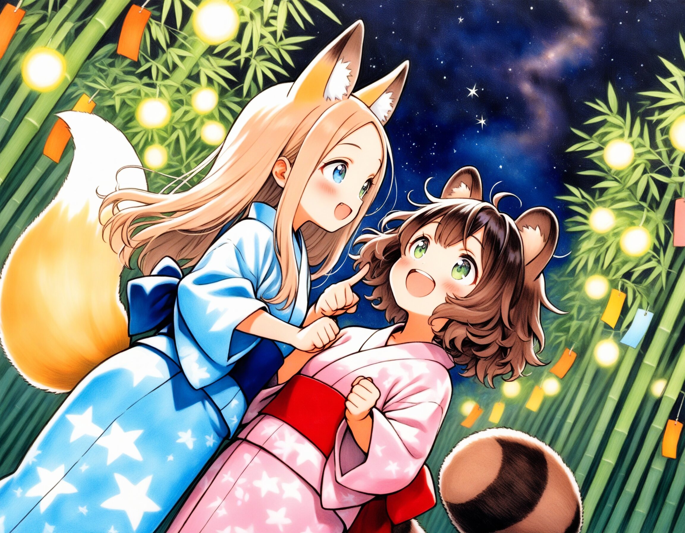 2girls, loli, chibi, cute deformed, general, mid, tanabata, bamboo tree, colorful tanzaku, yukata, kimono, starry sky, night, clear sky, sparkling stars, emotional, heartwarming, looking up, warm atmosphere, soft lighting, glowing lights, detailed, high detail, vibrant colors, traditional japanese clothing, friends, night scene, outdoors, summer night, from below, colored colored pencil \(medium\), colored pencil-style, traditional media, masterpiece, high score, great score, absurdres, scenery, ( oyari ashito, barasui:0.1), dynamic angle, dynamic pose, cowboy shot, BREAK 2girls, loli, light brown hair, medium hair, choppy bangs, blue eyes, (light brown fox ears, Light brown fox tail with white tip, petite), standing, pointing, joyful expression, BREAK 2girls, loli, dark brown hair, short hair, messy hair, short bangs, green eyes, tareme, (dark brown raccoon ears, dark brown raccoon tail with striped pattern), laughing, happy, pointing up,