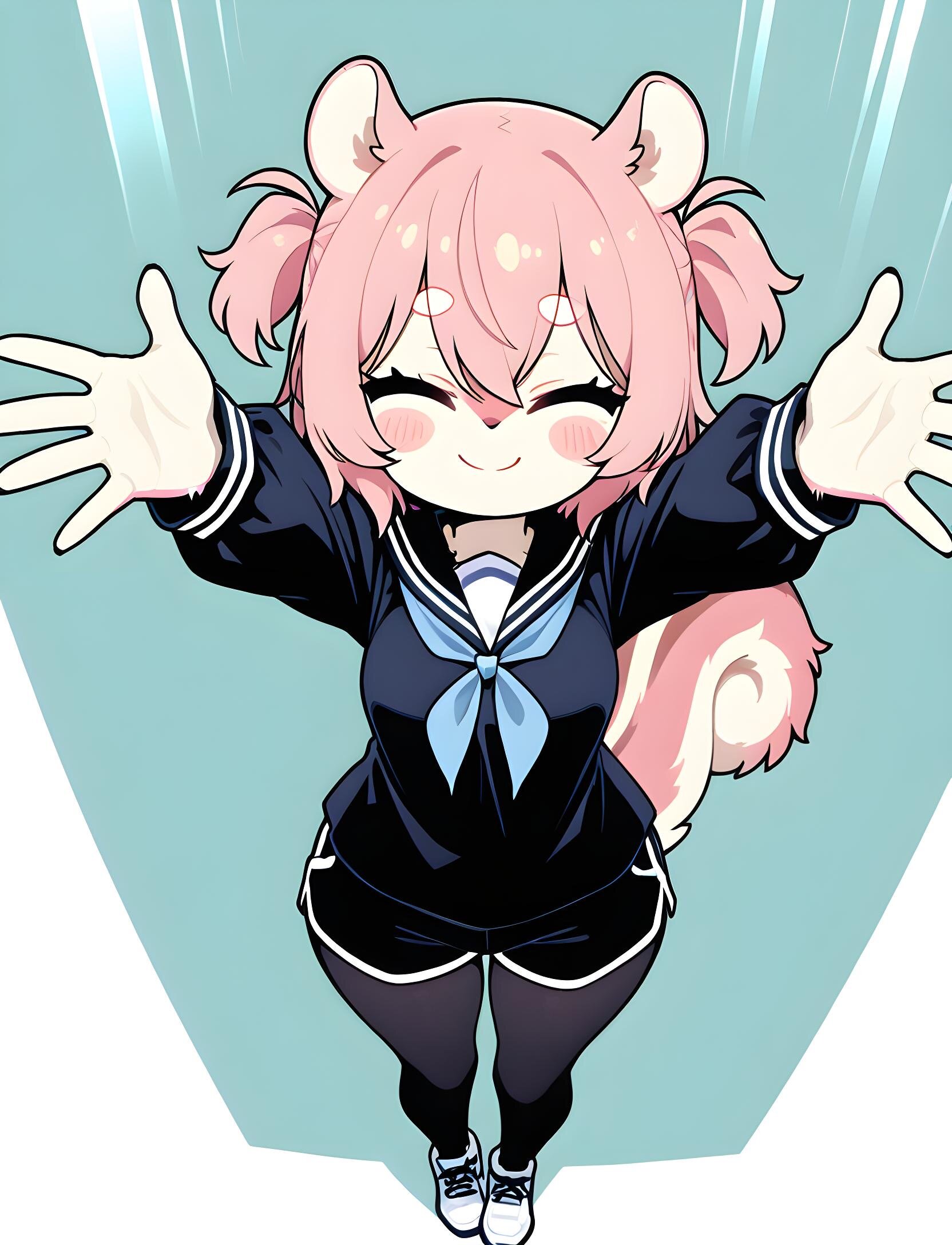 1girl,solo,short female,oppai loli,(squirrel girl),(furry female),pink squirrel ears,pink squirrel tail,(flat breasts),slim,thick thighs,wide hips,pink hair,short hair,two side up,pink eyebrows,hair between eyes,tsurime,eyes closed,smile,blush stickers,closed mouth,black serafuku,blue neckerchief,blue gym shorts,black pantyhose under shorts,white sneakers,incoming hug,hands up,arms up,aqua background,white border,looking at viewer,from front,from above,full body,cinematic lighting,beautifully lit,light rays,foreshortening,perspective,smooth,cinematic angle,(soft shade:1.4),(high contrast:1.2),(stylized),(kawaii),(cute),furry,(two tone fur),(furry body),perfect body,detailed face,visible wide hips,high quality,cute clothes,animal tail,animal ears,solo,voluminous thighs,masterpiece,gddw,((correct_anatomy)),,black pantyhose, flat color style, simple coloring style