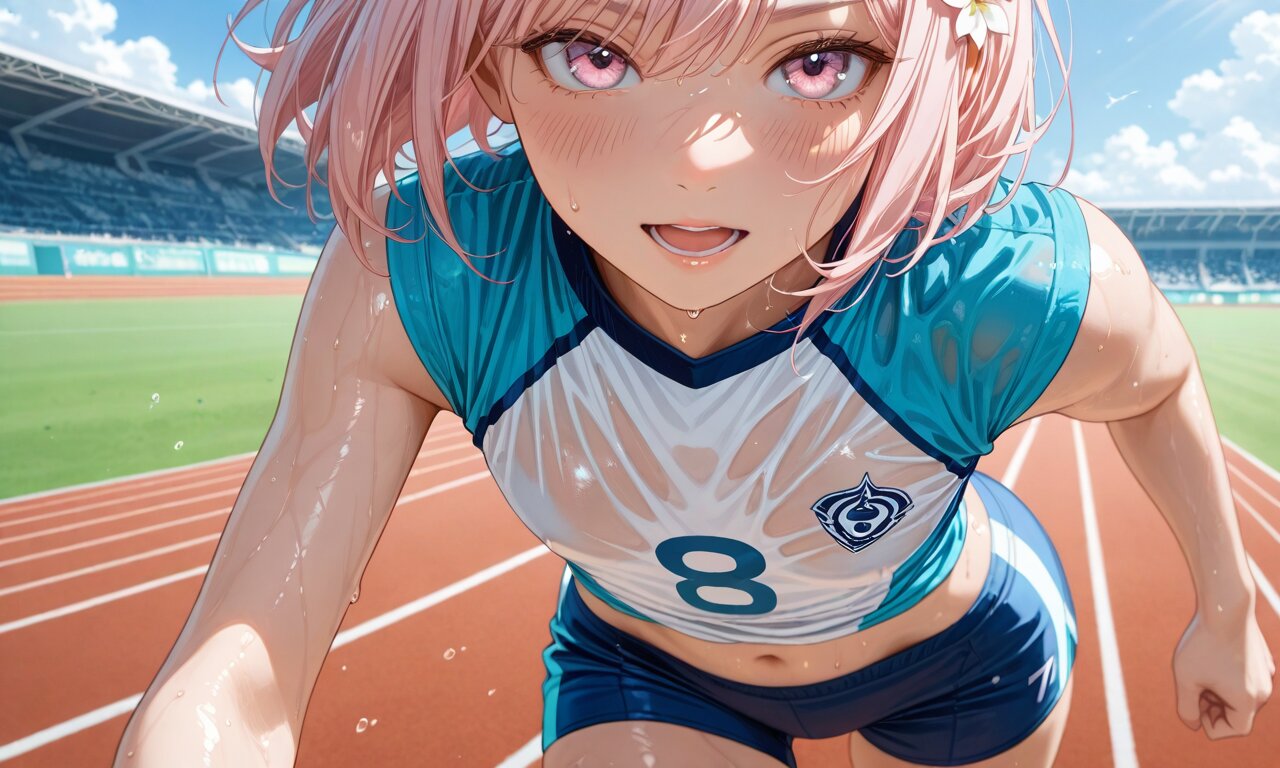 score_9, score_8_up, score_7_up, source_anime, masterpiece, amazing quality, very aesthetic, high resolution, ultra-detailed, absurdres, newest, scenery, 2d, semi-realistic, sharp focus, nice hands, perfect hands, perfect anatomy, perfect structure, (On a morning, the girl is sprinting at full speed on Athletics Track in girls high school, gaze at me with an Serious face, open mouth), outdoors, 1girl, solo, cowboy shot, high angle, from the front, (close-up eyes, face focus), (A sense of speed. A sense of dynamism). (She is wearing an skinny, Track and field uniform, running shorts). ultra detailed lips, ultra detailed face and hair, kawaii, adorable, cute, light pink hair,light pink eyes,loose wavy hairstyle,short bob cut,floral hair accessory, (flat chest, small chest), wide hip, sweat, wet clothes, BREAK, photorealistic, masterpiece, best quality, amazing quality, very aesthetic, high resolution, ultra-detailed, absurdres, newest, scenery, volumetric lighting,, anime style, anime color,, <lora:hyper-sdxl-12.1-045-055-:1> <lora:elf-san alpha1:0.7> <lora:elf-san alpha4(IL1.0):0.7>