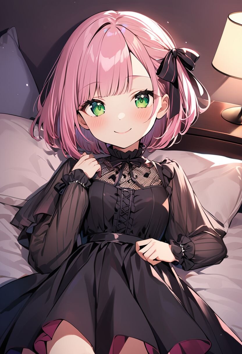 1girl, solo, 15years old, bob cut, blunt bangs, pink hair, green eyes, hair ribbon, jewelry, long sleeve, flare sleeve, white lace blouse, black dress, cabaret mini dress, party dress, cute, stylish, super mini, a-line, ruffle, high neck, (ribbon on neck), (naughty smile), ((lying back)), upper body, at night, bedroom, on bed, indoors, lamp, face focus,