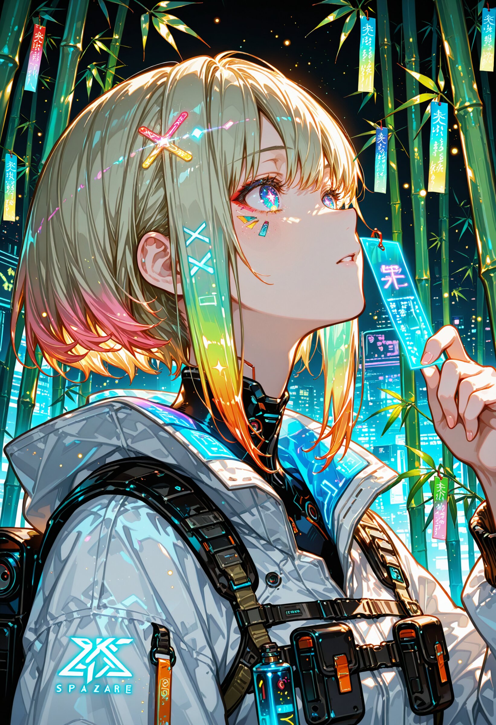 1girl, solo, upper_body, cyberpunk, night, neon_lights, futuristic_city, bamboo, bamboo_leaves, decorated_bamboo, tanzaku, glowing_tanzaku, holding_tanzaku, attaching_tanzaku, tanzaku_attached_to_bamboo, light_particles, sparkles, glowing_paper, floating_lights, magical_effects, atmospheric_lighting, colorful_lighting, hologram, electric_signs, vibrant_colors, close-up, techwear, glowing_hair, glowing_eyes, looking_up A close-up view of a girl in futuristic techwear tying a glowing tanzaku strip to a bamboo branch already decorated with luminous paper strips. The bamboo leaves shimmer with neon highlights, and dozens of tanzaku hang gently, glowing softly in the electric night air. Sparkles and light particles fill the scene like ambient digital dust. An upper-body shot of a girl attaching a glowing tanzaku to neon-lit bamboo in a cyberpunk city. She holds the strip delicately as her hand reaches up toward the leaves. The bamboo is already adorned with colorful, illuminated tanzaku. The background glows with electric signs, holographic elements, and a gentle rain of sparkles and particles. The scene is warm and luminous, combining tradition and futuristic wonder.