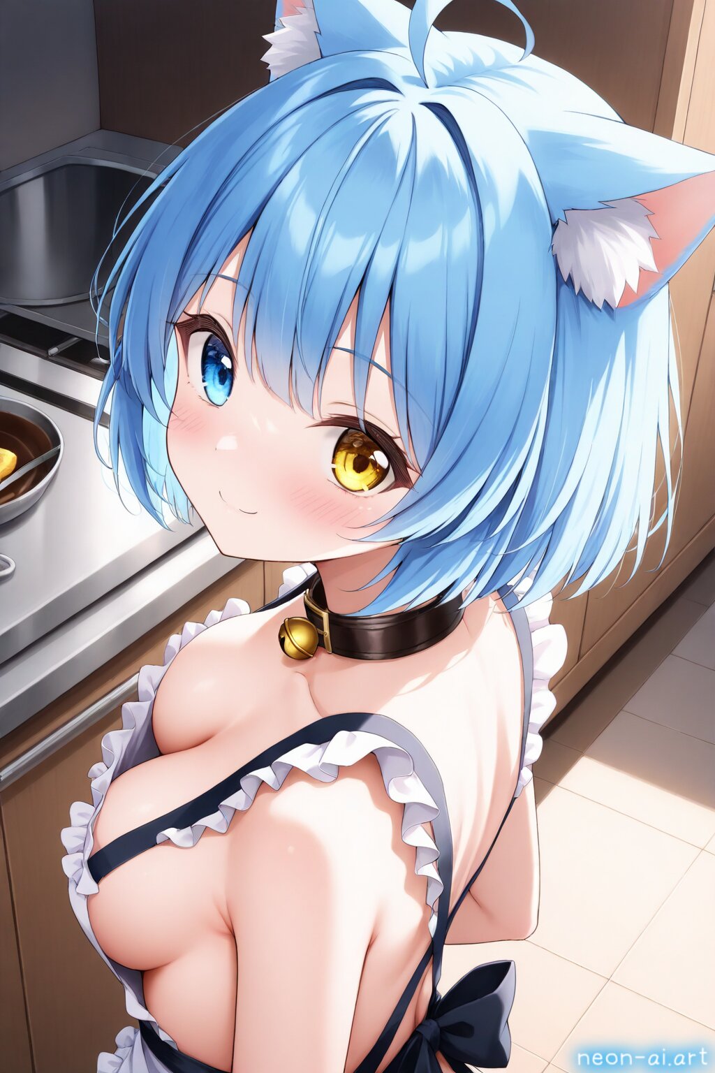 from above, blush, bashful, smile, sideboob, naked apron, off-shoulder, bare sholder, sleeveless, bare arms, frilled apron, waist ribbon, back view, backless, kitchen, looking at viewer, upper body, collarbone, medium breasts, cleavage,