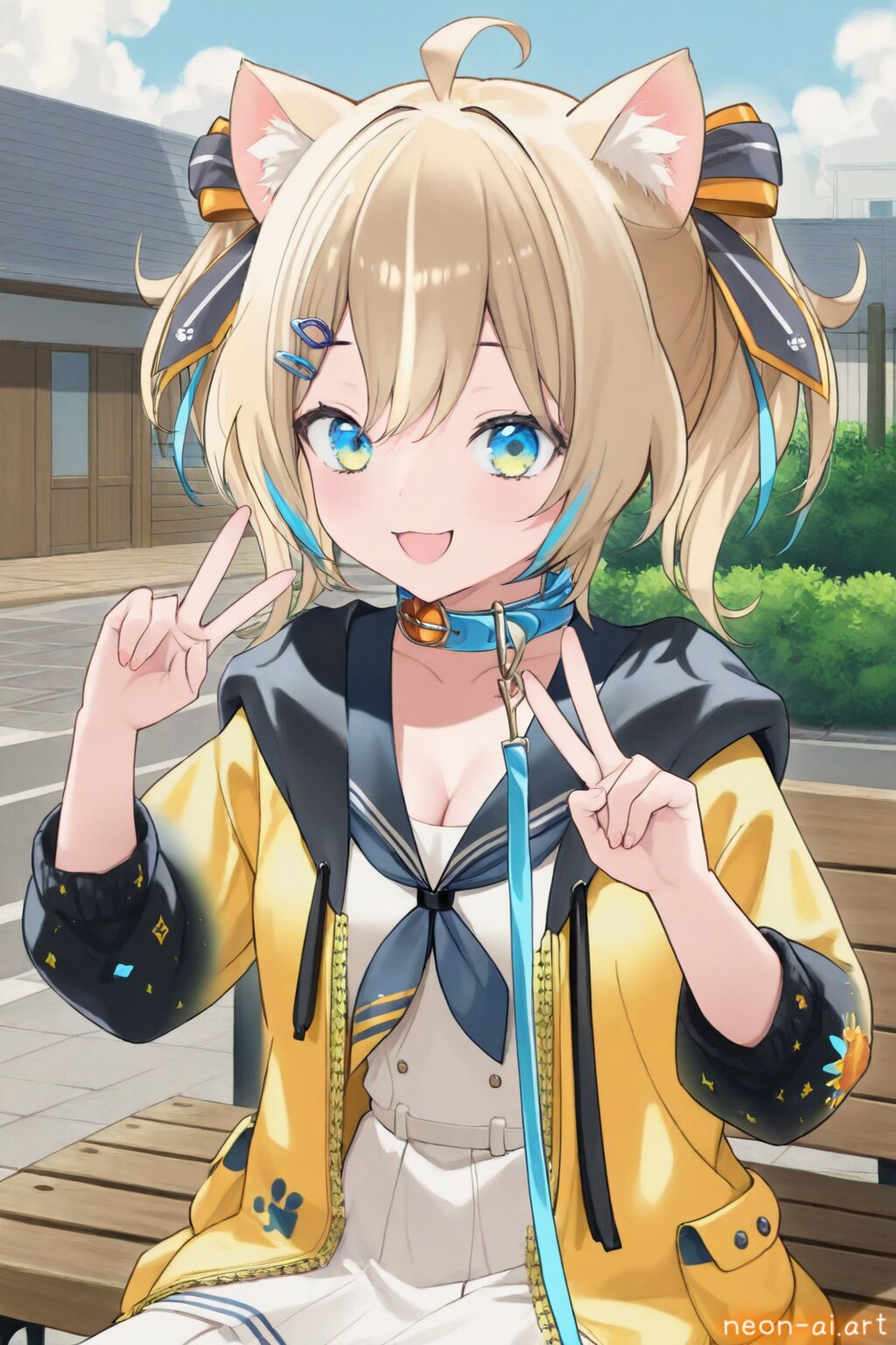 appare hinata, twintails, short hair, ahoge, hairclip, hair ribbon, collar, leash, yellow jacket, hooded jacket, white dress, sailor collar, blue neckerchief, sailor dress, short sleeves, double v, sitting, wooden bench, wooden table, blue sky, street, brick house, bush, yellow flower, smile, open mouth, cat ears,