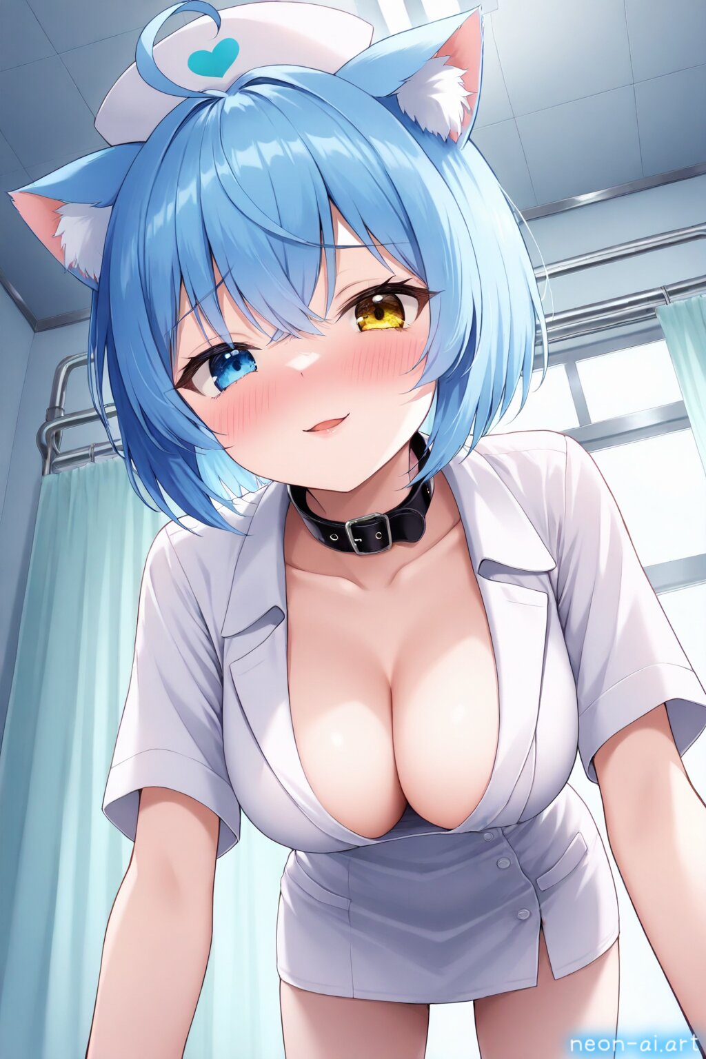 from below, looking down, face down, blush, bashful, embarrassed, naughty face, parted lips, nurse, white dress, nurse cap, heart on hat, short sleeves, short dress, leaning forward, indoors, hospital room, curtains,