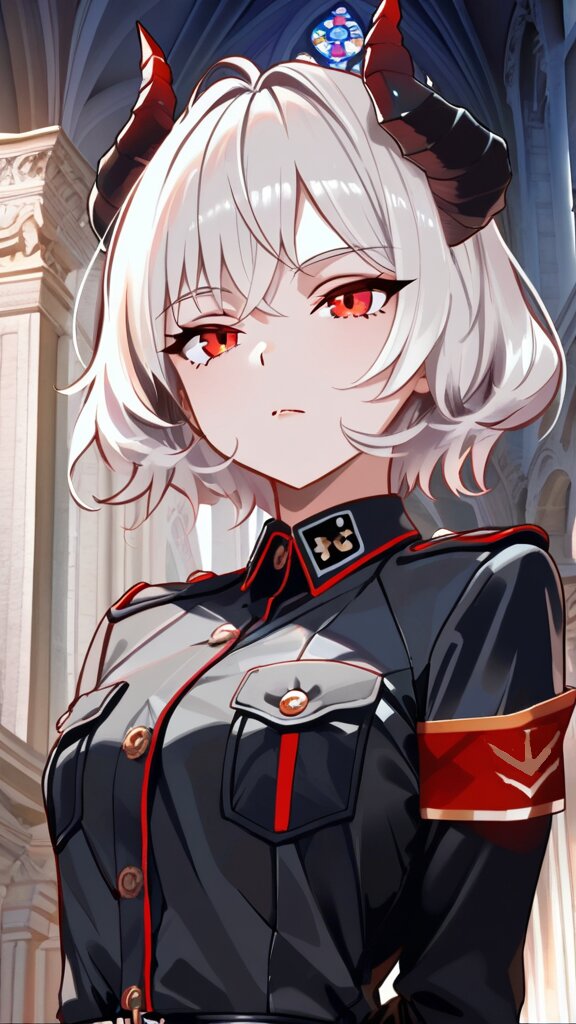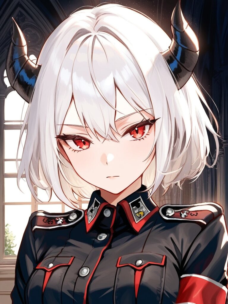 solo, girl, short hair, white hair, demon horns, red eyes, small eyes, tsurime, expressionless, closed mouh, black military, black military uniform, chest pocket, red armband, *HassakuXLを使用しております。加筆修正等も加えている為、そのままプロンプトを入力しても出力されない可能性があります