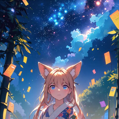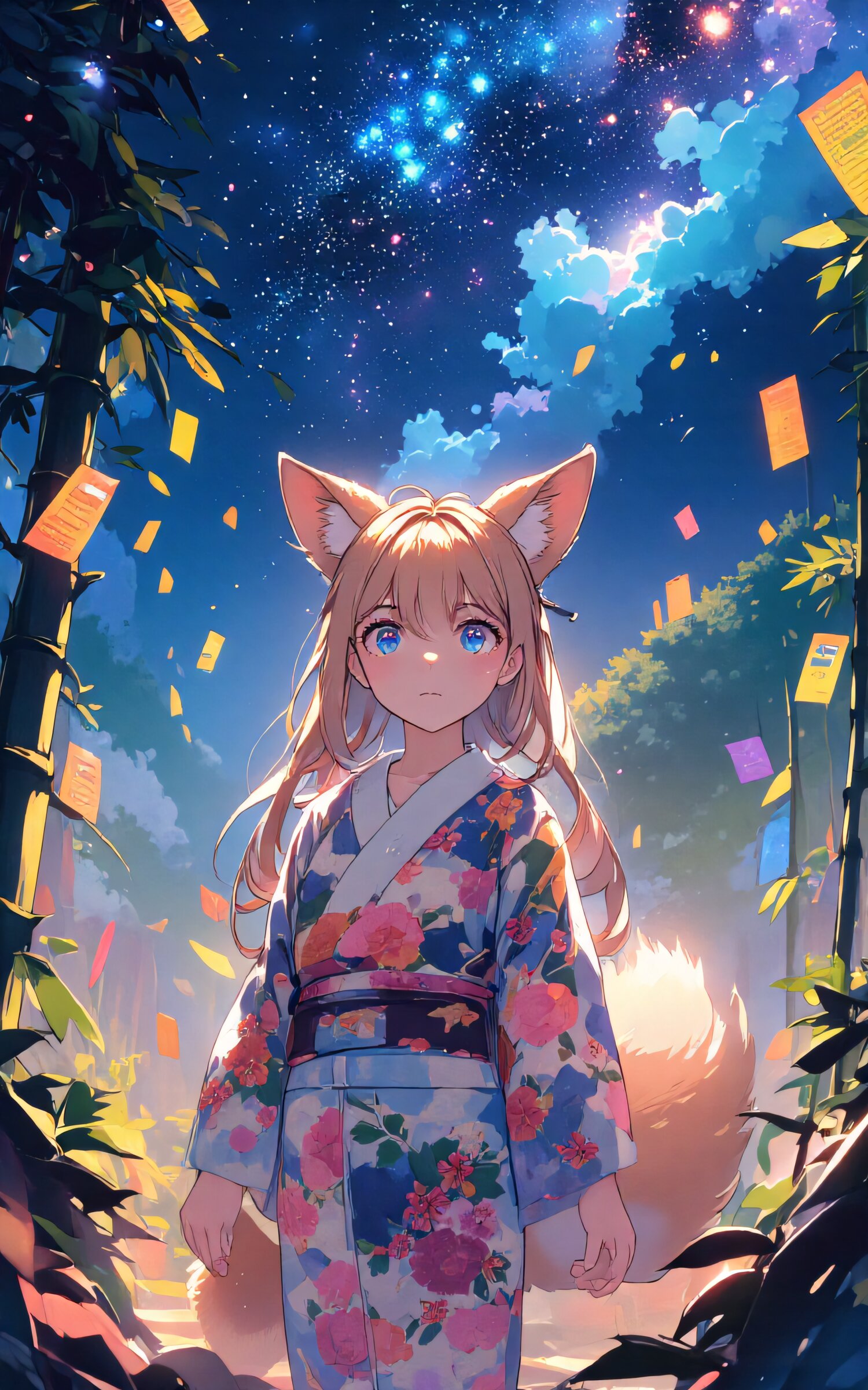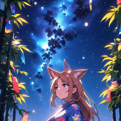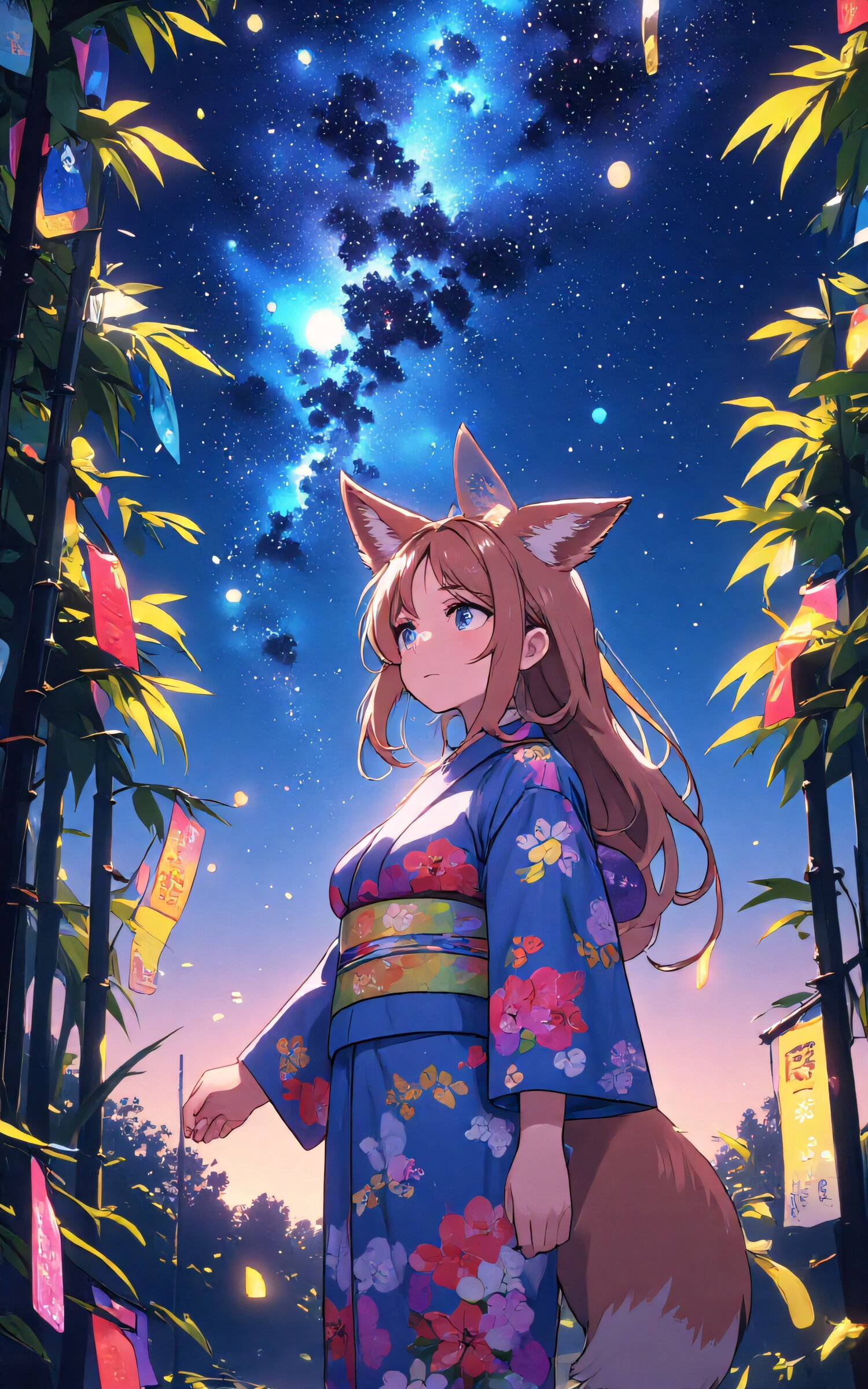 anime style, high resolution, full body, fox-eared girl, long light brown hair, double eyelids, long delicate eyelashes, fluffy fox tail, small cute fangs, wearing a traditional yukata with floral patterns, standing under the starry sky, looking up at the Milky Way, surrounded by bamboo leaves and colorful tanzaku (wish papers), soft glowing lights, gentle and wistful expression, cinematic lighting, dreamy and magical atmosphere
