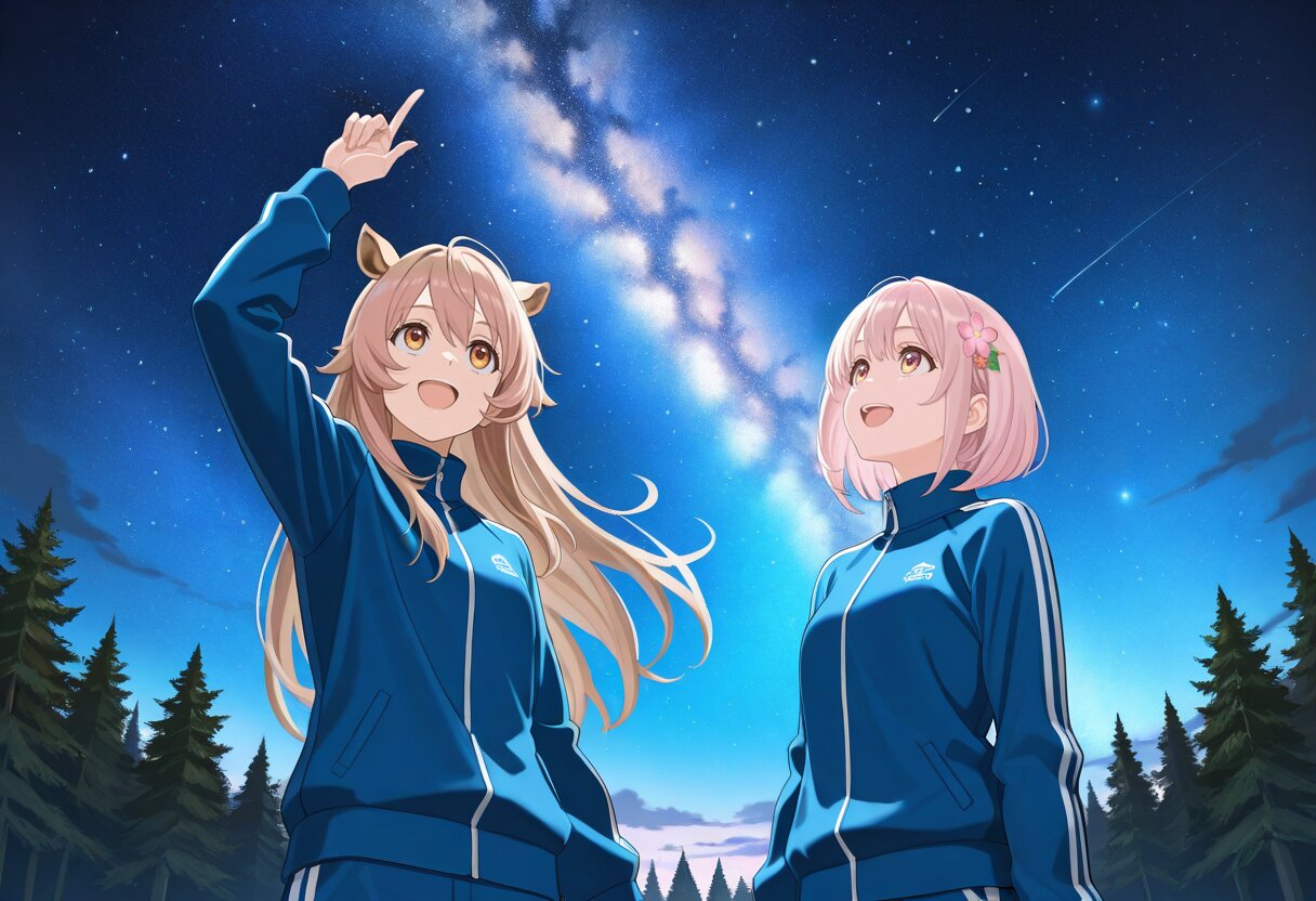 宇猪崎りりあさんとひなこさんが、七夕の季節に行われた林間学校で、夜に天の川を一緒に楽しまれる場面を表現致しました。