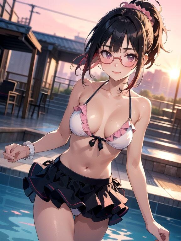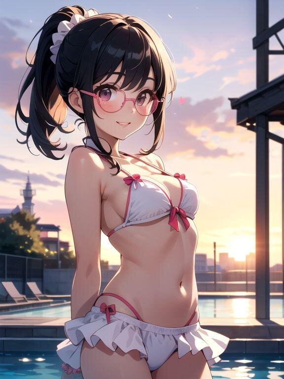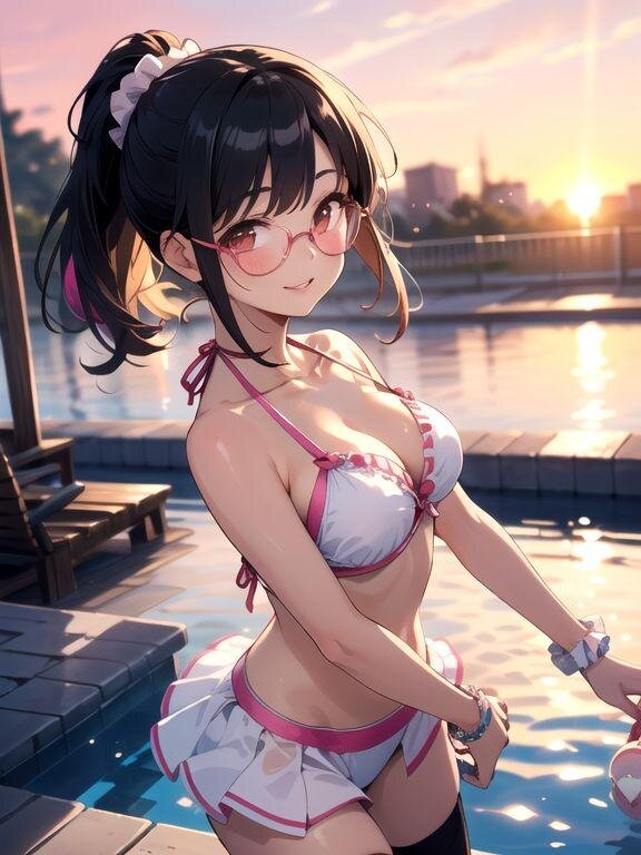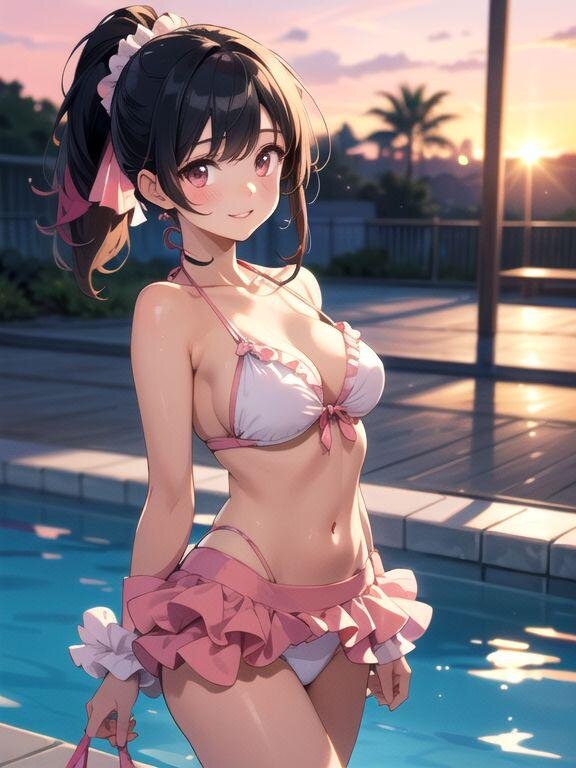 A 2025 summer JENNI love brand-inspired bikini coordinate, pastel pink and white frilled bikini, triangle bikini top with aurora tape straps, high-waisted bikini bottom with side tie ribbons, layered with a crochet cover-up skirt, accessorized with a pearl-embellished hair scrunchie and heart-shaped sunglasses, set against a sparkling poolside at sunset with a pink sky, semi-realistic anime style, vibrant colors, soft lighting, dynamic pose, detailed fabric texture, translucent skin, trendy and cute vibe, negative prompt: distorted face, blurry background, unnatural hands,--v 6 --style ,tan,tanlines,fair_skin,