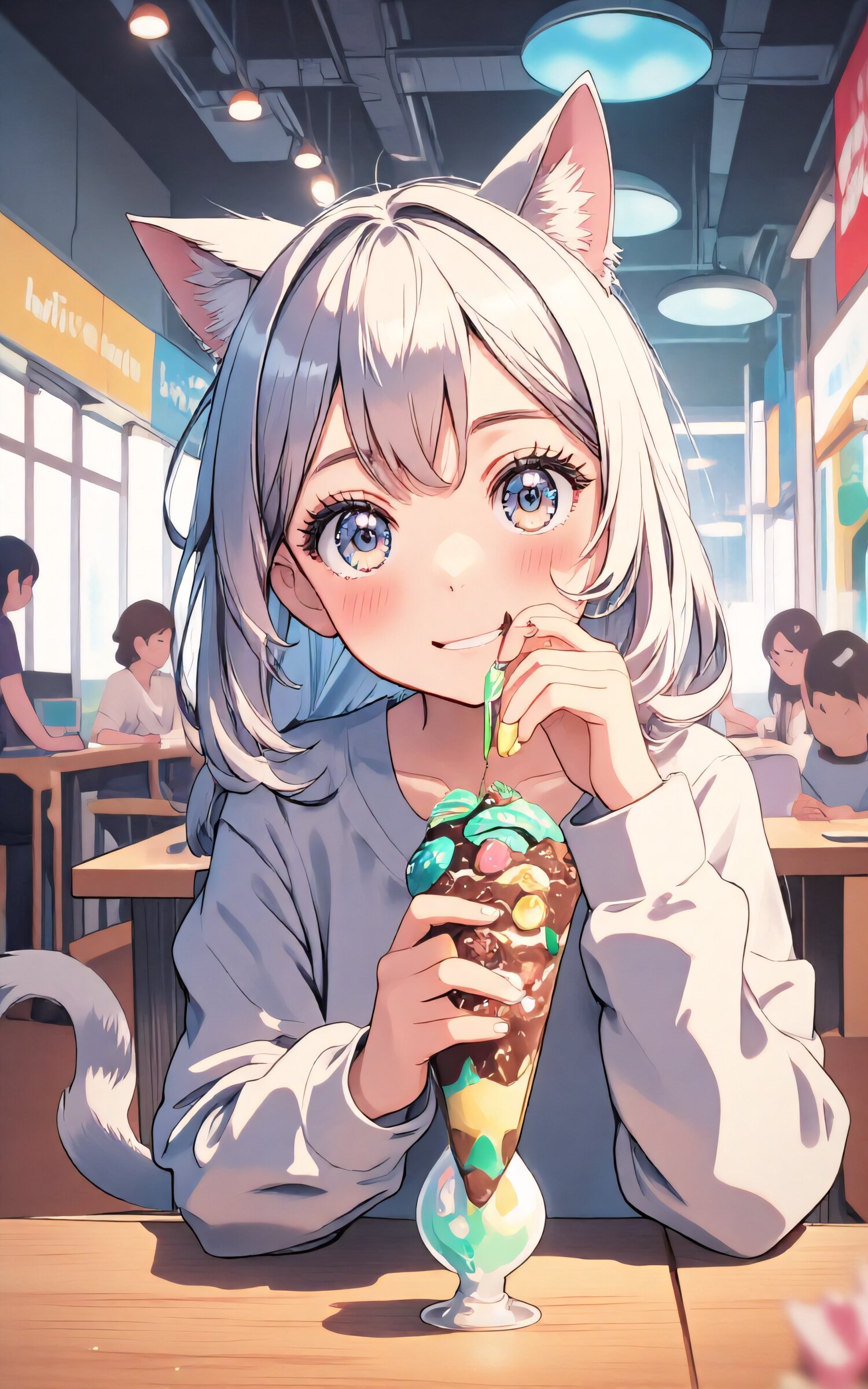 anime style, high resolution, full body, cat-eared girl, long silver hair, double eyelids, long delicate eyelashes, fluffy cat tail, small cute fangs, wearing casual clothes, sitting at a table in a food court, happily eating a chocolate mint parfait, colorful dessert, bright indoor lighting, relaxed and cheerful expression, slice of life atmosphere, soft background blur