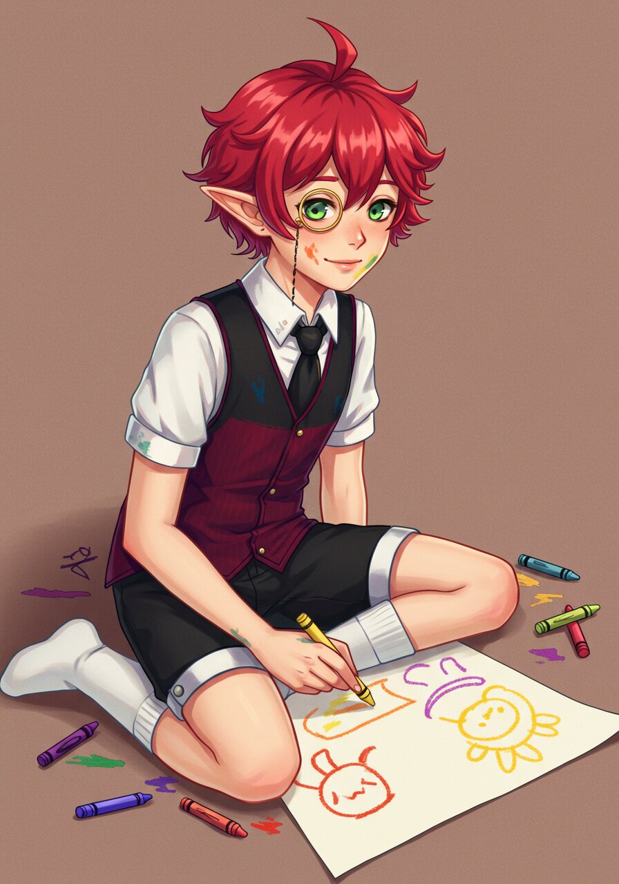 A young, elf-eared boy with fluffy, vibrant red hair styled similarly to Ragatha from "The Amazing Digital Circus". His left eye is covered with a monocle. He has gentle green eyes and a shy, innocent-looking face, now focused in quiet concentration. He wears a short-sleeved white shirt with a black necktie, and a fitted vest with a black front panel and dark red (maroon) side panels. He also wears black shorts with the cuffs rolled up to reveal white lining. His outfit is completed with white socks and black shoes. He is sitting on the ground or at a low table, holding a colorful crayon in one hand and drawing on a large sheet of paper. Around him are scattered crayons in various colors and simple, childlike drawings of animals, stars, or abstract shapes. His expression is calm and absorbed, with a hint of contentment—as if lost in his own little world. A bit of color might be smudged on his fingers or cheek. Full body or three-quarters view, seated pose. The art style is semi-realistic anime, with soft shading, detailed fabric and crayon textures, and a gentle, cozy atmosphere.