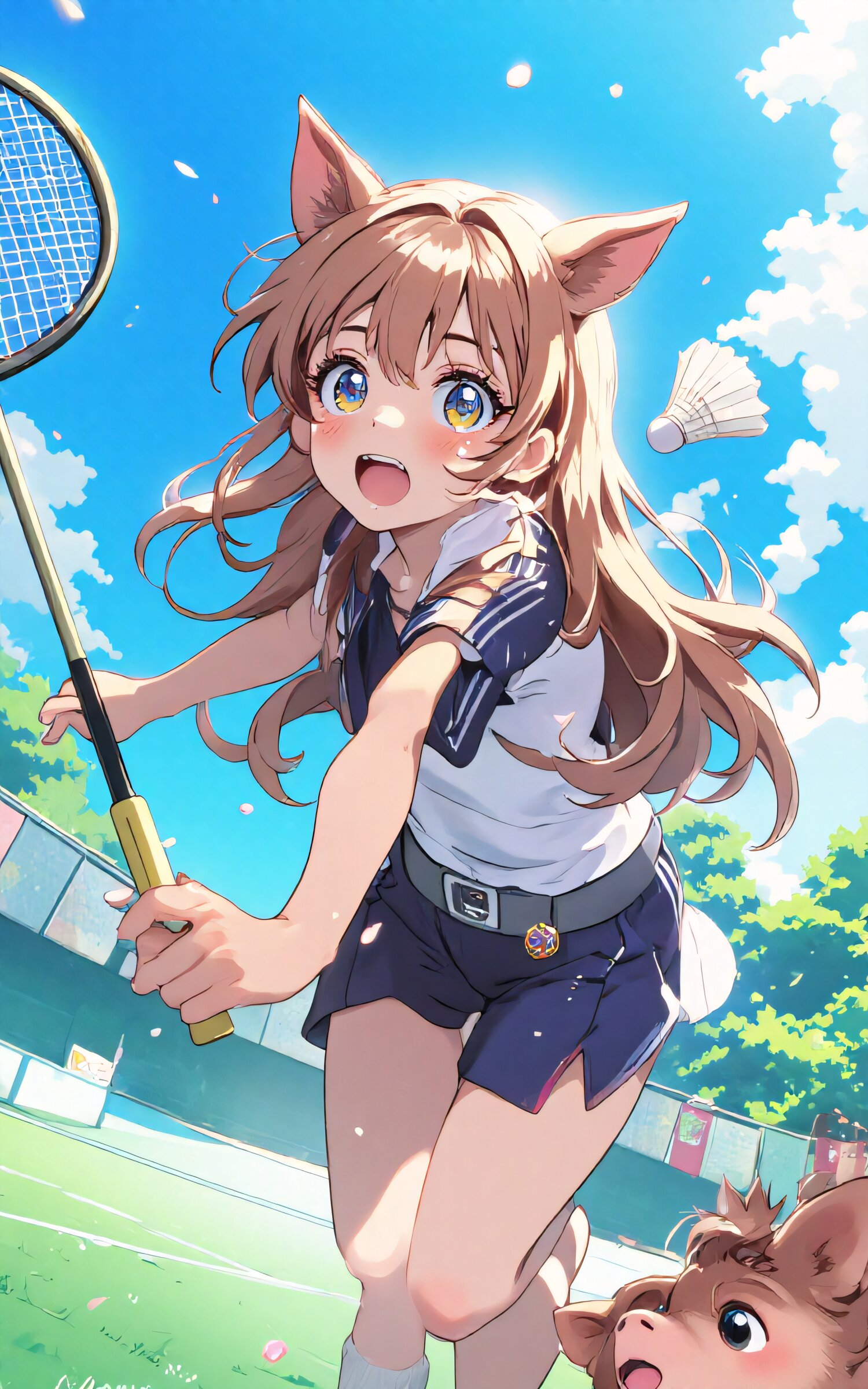anime style, high resolution, full body, girl with boar ears, long light brown hair, double eyelids, long delicate eyelashes, wearing a Japanese gym uniform, playing badminton, shuttlecock floating in the air, hair fluttering in the wind, sparkling sweat on her face, standing on a school field under the blue sky, dynamic pose, energetic and cheerful expression, small wild boar piglet (uribō) at her feet, vibrant and lively atmosphere