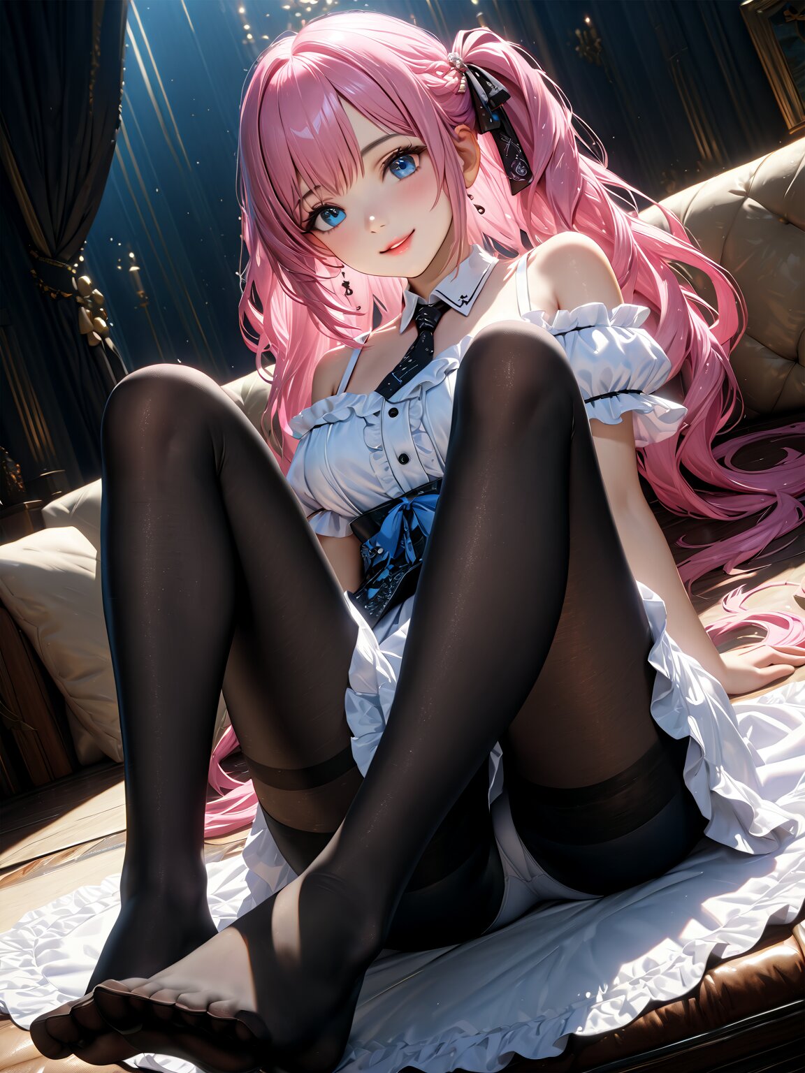 cinematic lighting, dramatic lighting, cinematic atmosphere, highly detailed, ultra-detailed, (best quality, 4k, 8k, highres, masterpiece:1.2), ultra-detailed, Transparency:1.2, beautiful breast, margin, (realistics:1.5), photorealistics:1.3, photographic, extremely cute and beautiful girl, detailed white face, beautiful detailed eyes, shine pink hair:1.2, Transparency pink hair:1.2, sparcle blue eyes, beautiful breast, smile, beautiful detailed pink lips, breast, shine:1.5, white offshoulder, gray short skirt, beautiful callarbone, wa lolita1.3, natural light, one side only low pigtail:1.2, tie one side only low pigtail, one side only tie hair;1.2, sholoder hair, only pigtsil, black opaque pantyhose, (thick jetblack tights:1.6), beautiful black pantyhose, toes covered black pantyhose, white panties covered black pantyhose, sit down, focus on the toes, sole of foot stamp <lora:flat2:0.7000000000000002> <lora:Asian_Cute_Face:2.0000000000000004>