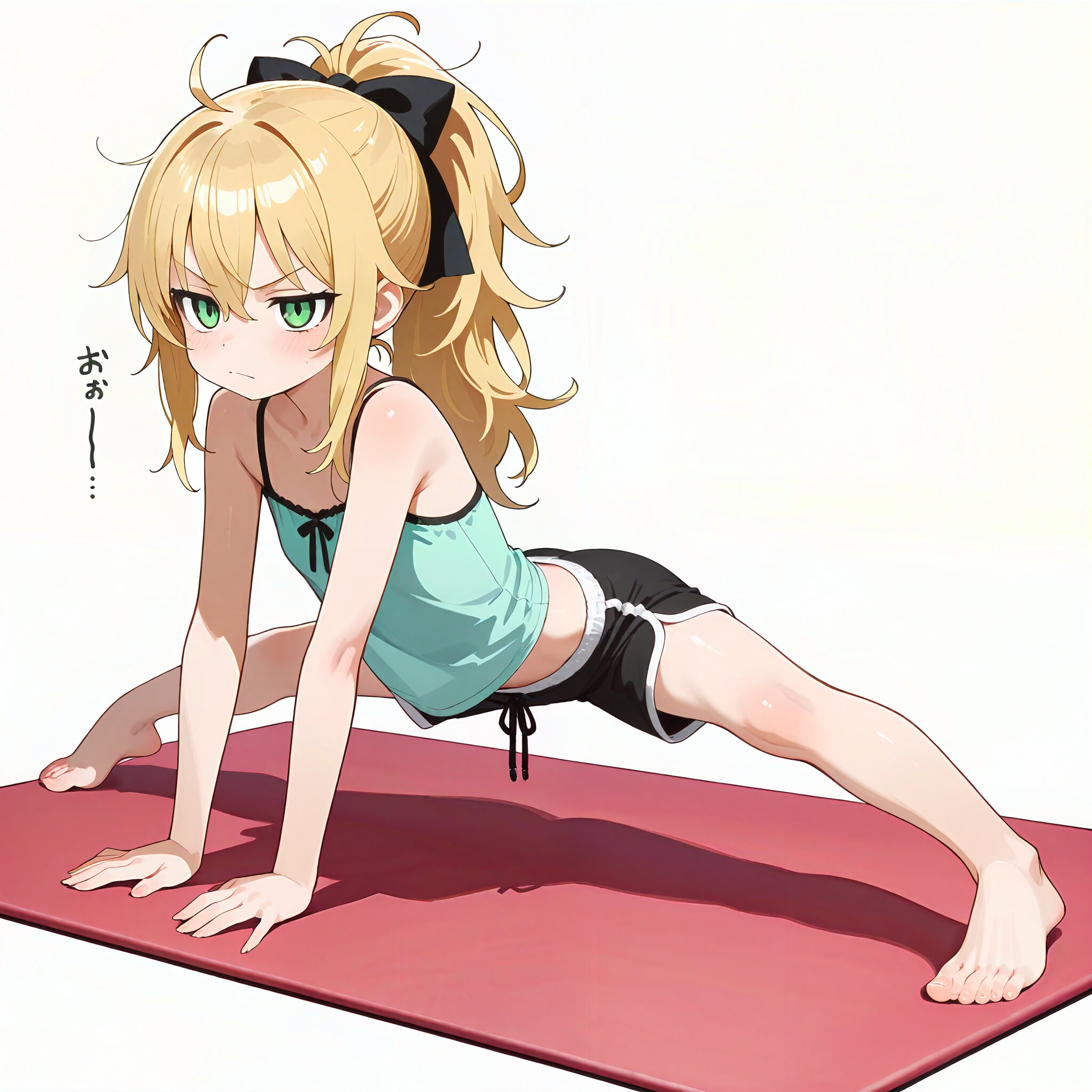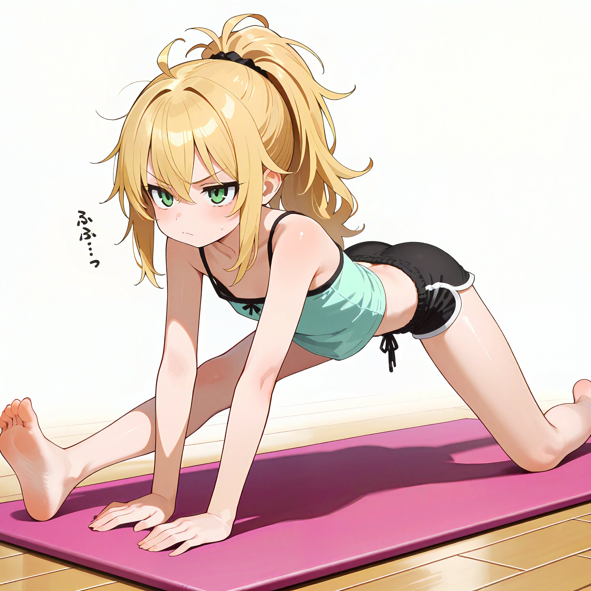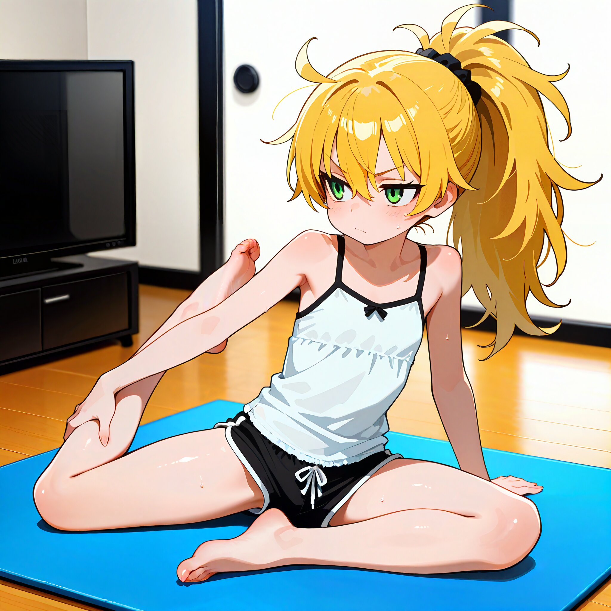best quality, high quality, ultra detailed, high detail, hyperrealism, high resolution, intricate details, absurdres, yoga, practicing yoga, yoga mat, BREAK //Character (loli:1.2), skinny, (skinny limbs:1.2), long hair, messy hair, ponytail, blonde hair, green eyes, sharp eyes, glaring, BREAK playful, wearing comfortable loungewear, camisole, black shorts, barefoot, downward-facing dog pose, (medium shot:1.5), BREAK <lora:ZankuroStyleIllustrious_v2:0.5>, <lora:xl_yujia(a3.1):0.8>, <lora:flat_sdxl:1.2>,