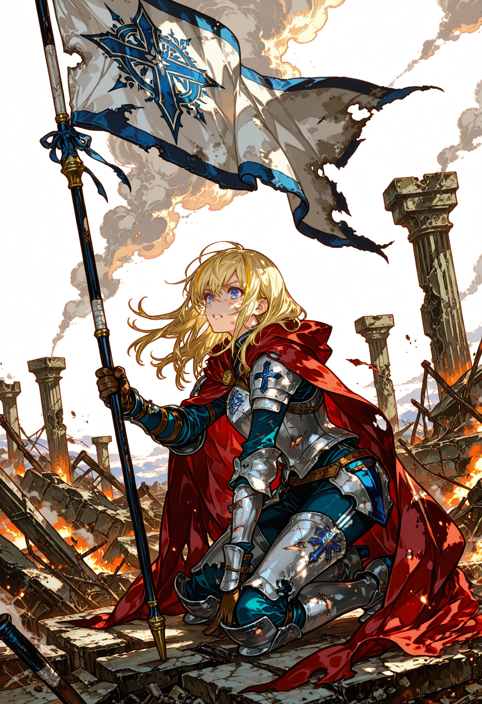 1girl, solo, side_view, kneeling, collapsing, leaning_on_flag, gripping_flag, flag, dynamic_pose, battle_damage, tattered_cape, torn_clothes, wind, hair_flapping, long_hair, blonde_hair, blue_eyes, cape, medieval_armor, shining_armor, intricate_design, chest_armor, dramatic_lighting, glowing_particles, floating_ash, ruins, battlefield, divine_light, sunlight_through_smoke, sacred, epic_composition, tears_in_eyes, intense_eyes, determined_expression, emotional, glowing_flag, cinematic_angle, The girl is kneeling from the side, collapsing forward, her hands gripping a tall battle flag that prevents her from falling completely. Her blonde hair and cape billow in the wind. Her armor bears the scars of war, but divine light breaks through smoke behind her, illuminating her figure like a saint. Her face is dirty and tear-streaked, yet her blue eyes shine with unyielding determination. Glowing ash floats through the air as the flag she clings to glows faintly with a sacred radiance.