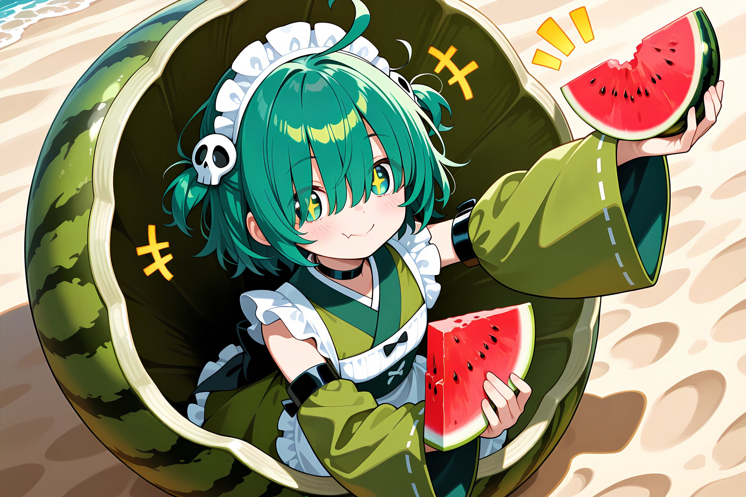 1 little girl, solo, diagonal angle, masterpiece, best quality, amazing quality, very aesthetic, cobalt green hair, short hair, messy hair, (hair over eyes:1.2), green eyes, demon fangs, +_+, closed mouth, smile, cheerful, +++, notice lines, choker, green wa maid outfit, (oversized sleeves:1.2), detached sleeves, (floating black ghosty hands:1.2), skull hair ornament, in huge shell, arm up, holding watermelon slice, in sand beach,