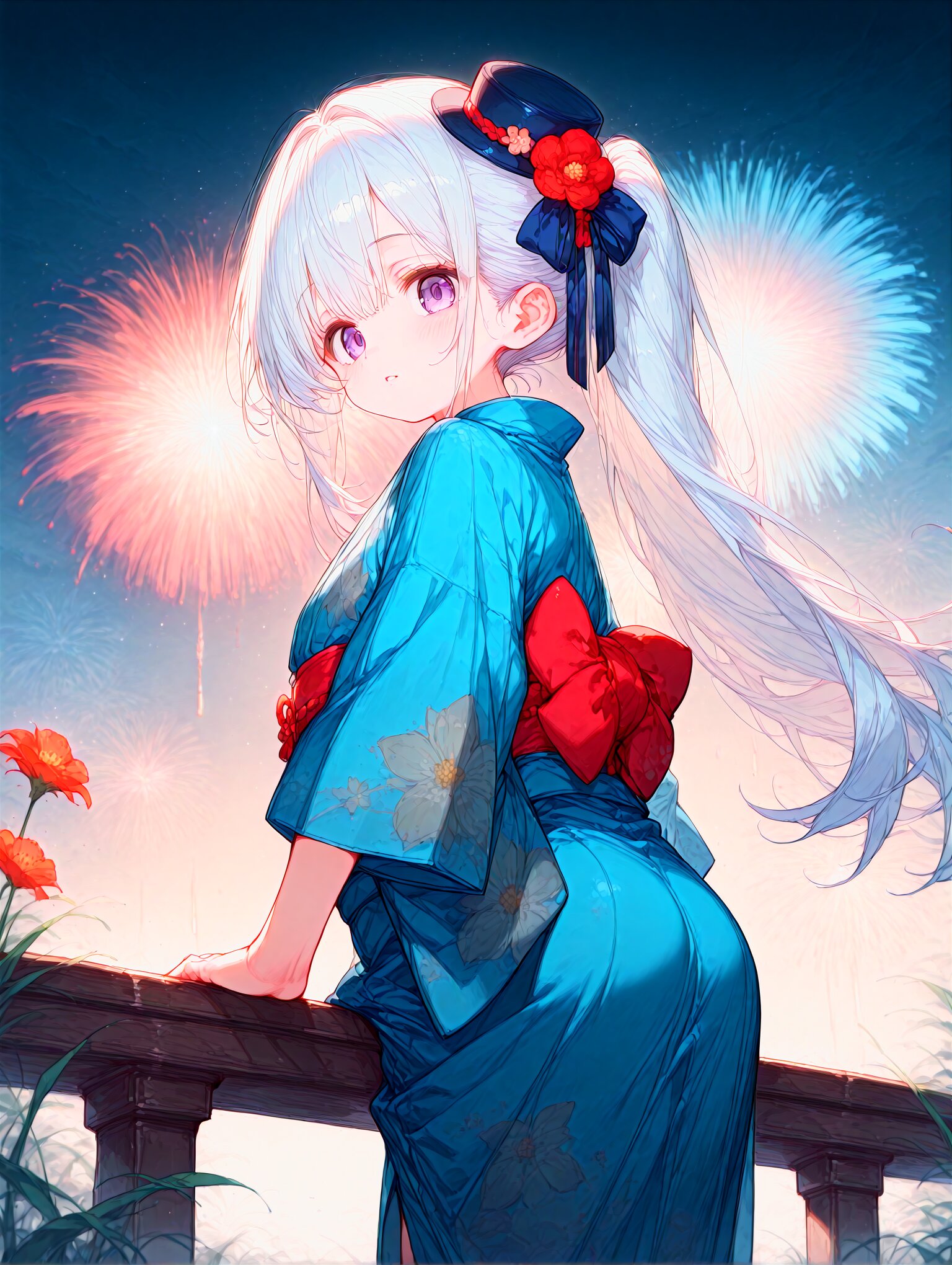 beautiful detailed background, best quality,( pale color,:0.7) scenery, detailed, intricate, dark theme, shadow, dark, solo, (watercolor_\(medium\):1.3), (fireworks:1.3), scenery focus, collarbone, parted lips,(Expressionless:0.8), big eyes,(half-closed eyes:0.8), tareme, pale purple eyes, (silver hair:1.1), (dark blue hair colored inner hair:0.8), ponytail, long hair,very long hair, eyebrows visible through hair, japanese clothes, blue yukata, (mini hat,:1.1) blue strapping ribbon and bow, frills, round lighting, looking back, (ass:0.9), (,flower,:1.3) outdoors, botanical garden,, worm's eye view, pov, <lora:sdxl-shadow_01:-1.3> <lora:noline-16oa:-1.55> <lora:sdxl2-flat2-512b:-1.2>