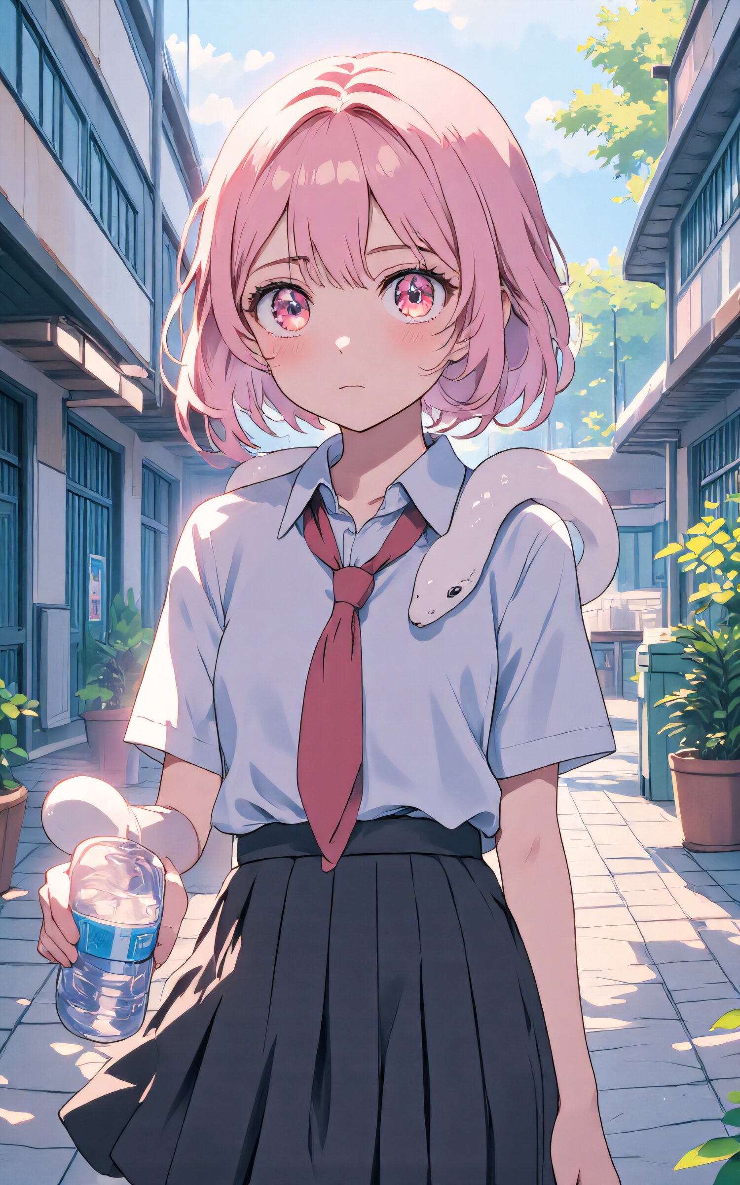 anime style, high resolution, full body, girl with light pink hair, wavy short bob hairstyle, pink eyes, double eyelids, long delicate eyelashes, wearing a Japanese school uniform, holding a plastic water bottle, accompanied by a white snake coiled around her shoulders or resting nearby, standing in a schoolyard , soft lighting, slightly surreal and whimsical atmosphere,