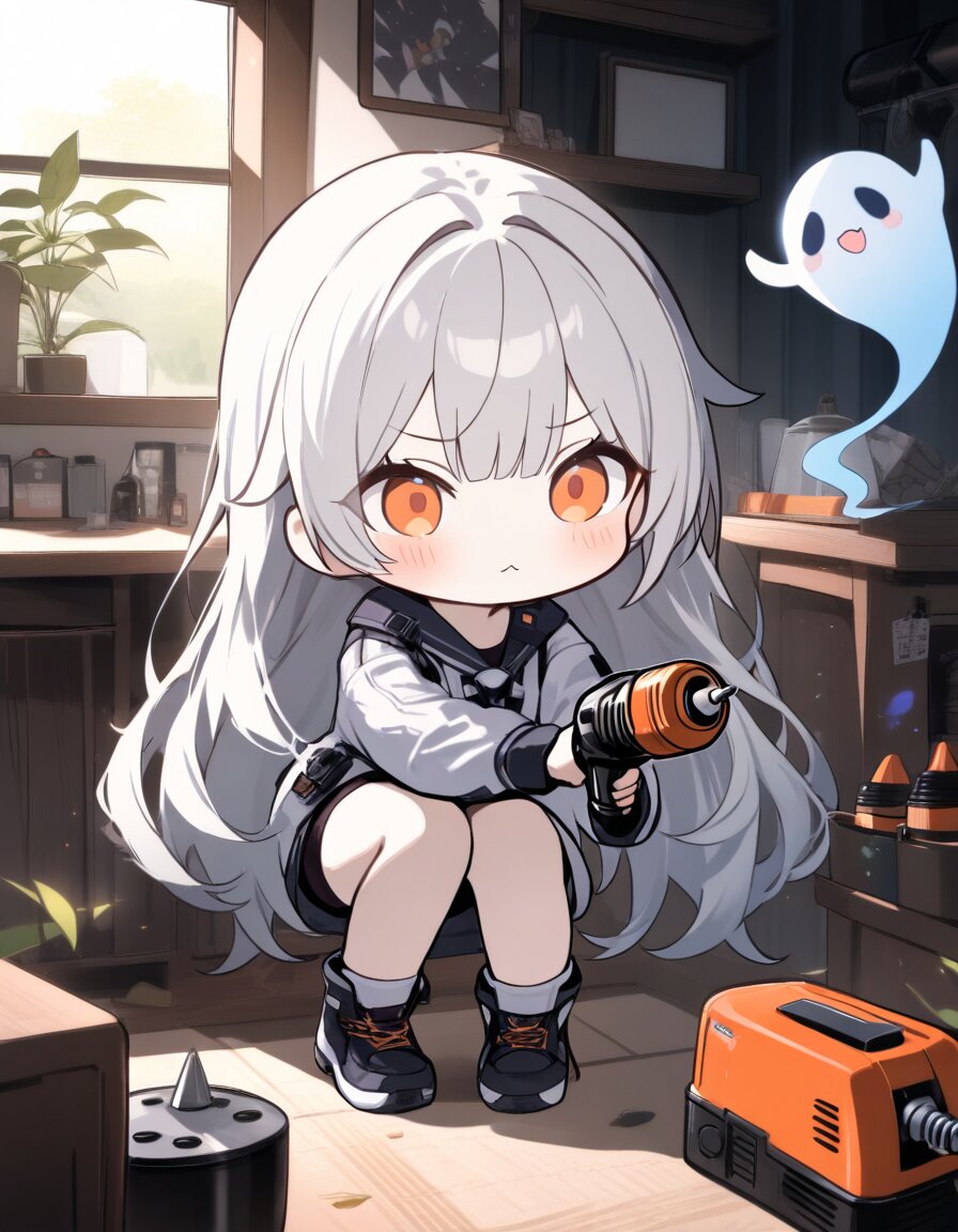 indoor, 1girl, solo, pale skin, silver hair, long hair, orange eye, power drill, holding, holding power drill, cute ghost, chibi, masterpiece, great score, high score, absurdres