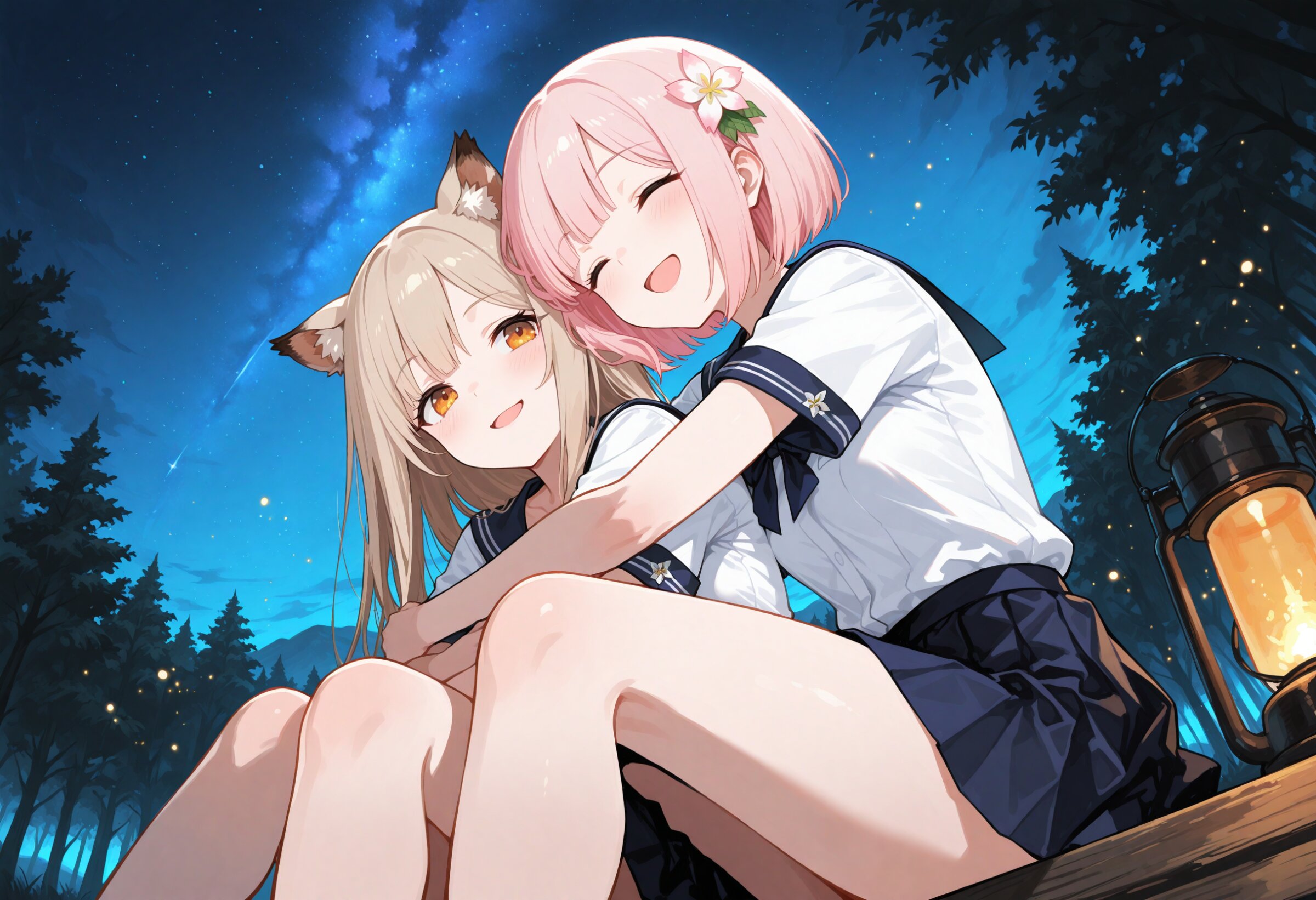 (masterpiece), (best quality), highly detailed, beautiful lighting, soft reflections, amazing composition, best quality, amazing quality, very aesthetic, absurdres, highres, newest, high detailed,Illustrious style, rating general,2girls,(girl, light brown hair, long hair, straight hair, amber eyes, (wild boar ear),small breasts, short-sleeved schoolgirl uniform) BREAK (girl, light pink hair,loose wavy hairstyle,short bob cut,floral hair accessory, short-sleeved schoolgirl uniform), chatting in the outdoors at night, soft lighting, summer camp atmosphere, futons, relaxed mood, close friendship,sitting, night sky, from below, dynamic pose, dynamic angle, innocent smile,open mouth,sparkling particles, glittery background, fantasy atmosphere, dreamy effect,atmospheric perspective,closes eyes,hug