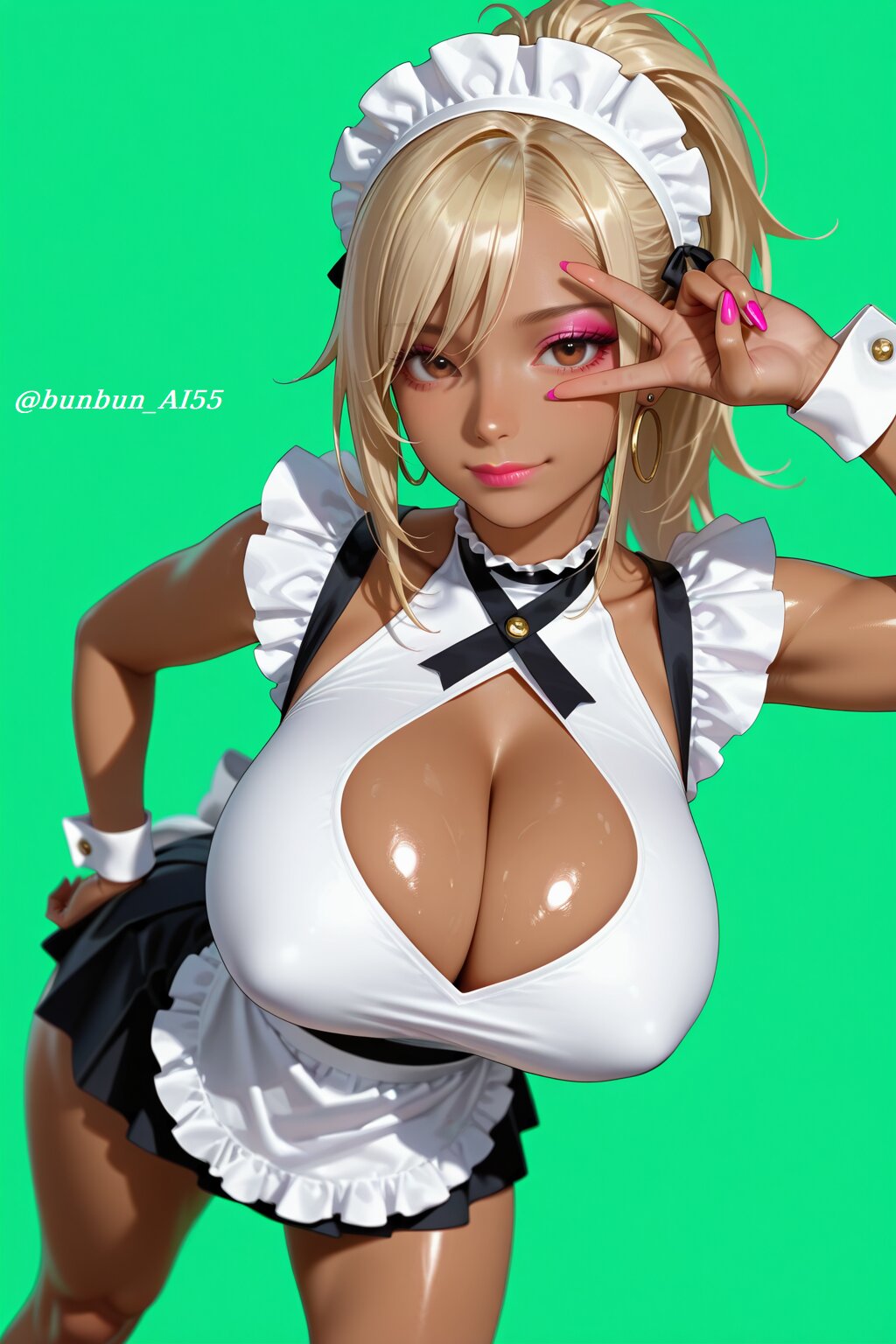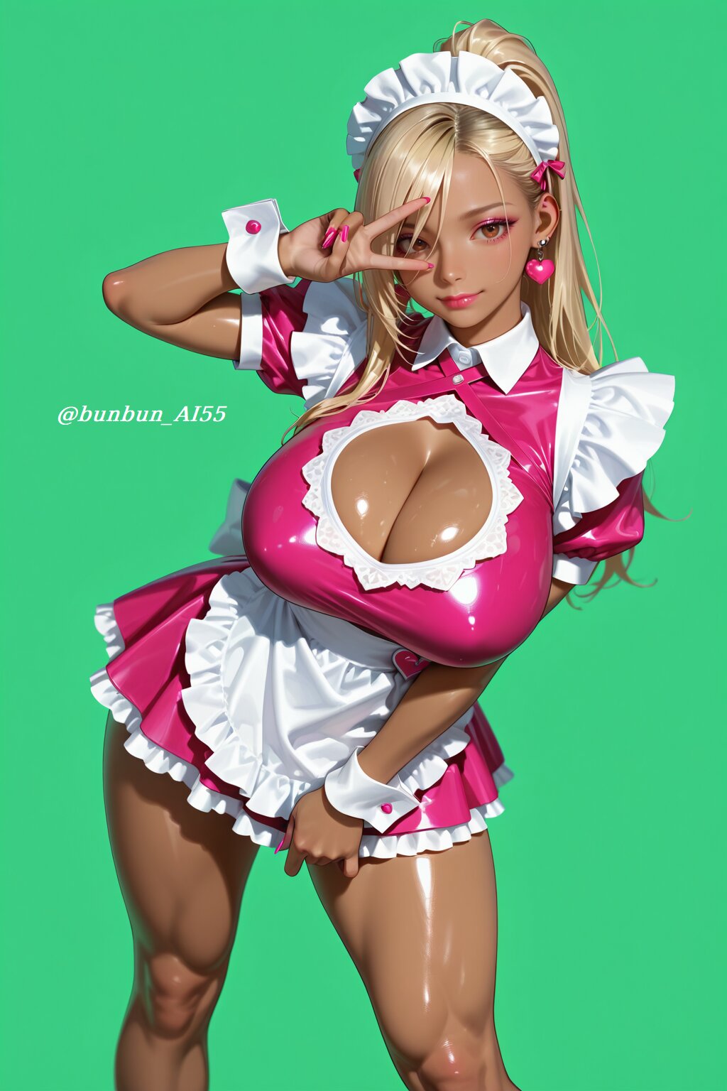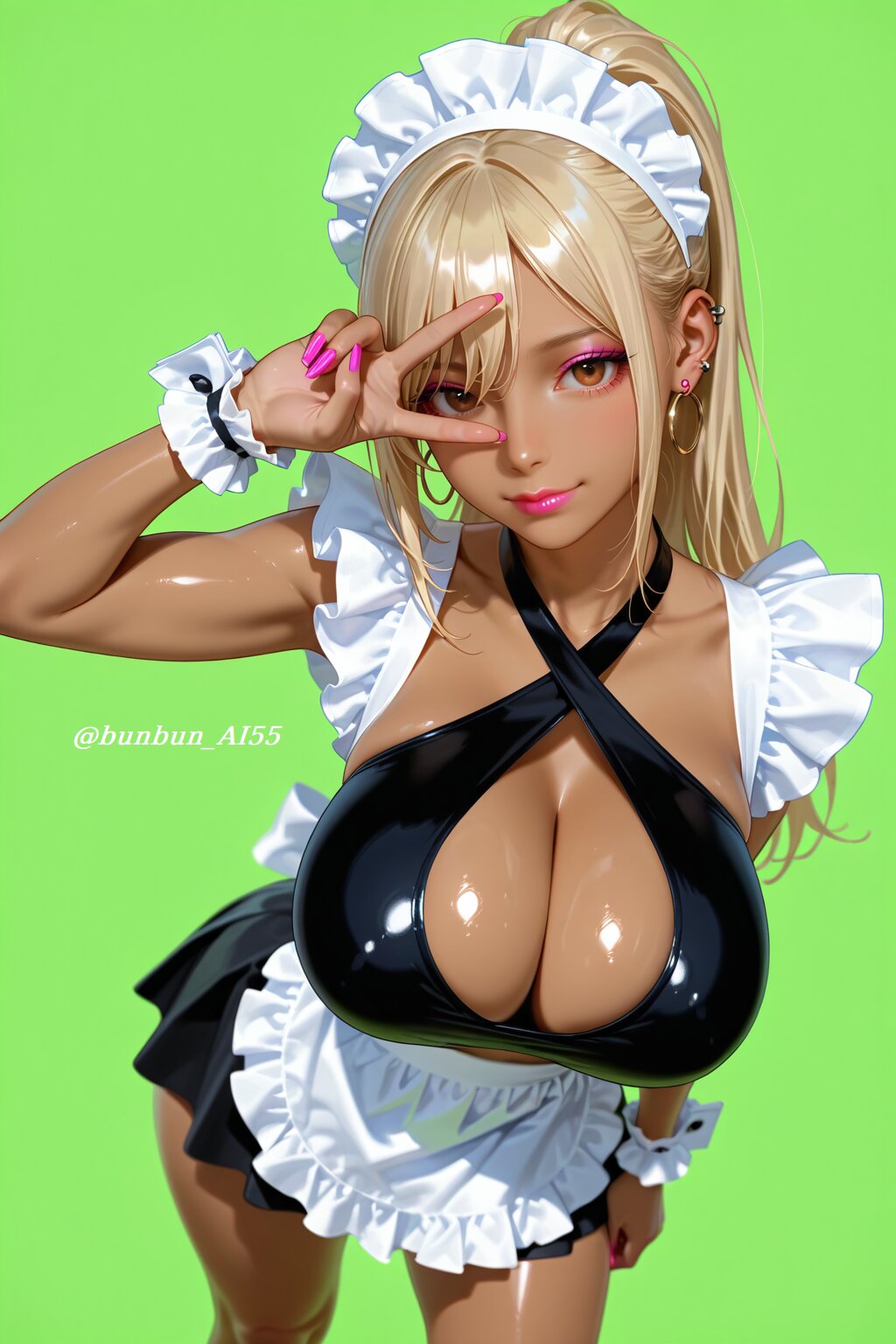 HDR, 8K,masterpiece, best quality, amazing quality, very awa, very aesthetic, absurdres, newest, detailed eyes, realistic eyes, realistic body, highres, add detail, sharp detailes, sharp lines, sharp focus, (realistic, hyperrealistic, photorealistic, realistic shading), sexy style, perfect anatomy, intricate details, high detail RAW color art, high contrast, digital painting, anime style, depth of field, BREAK perfect lighting, professional lighting, face lighting, (1girl, elegant beautiful gyaru:1.5, 18year old), (cute, kawaii, gyaru, idol, sexy, model, beauty), (gyaru face, idol face, beautiful face, slim face, small face, cute face, detailed face, brown eyes, gyaru makeup pink lips), (looking at viewer, alluring gaze, seductive smile), BREAK nsfw, (brown ponytail, straight hair), (jewelry, piercing, earrings), (huge breasts, pointy breasts), (long legs, thick thighs, muscle leg), (perfect hands), (shiny skin, glossy skin), (super model body:1.2, muscle body:1.2, slim body, athletic body:1.2), (light dark skin:1.1), BREAK (wearing a red criss-cross halter bikini maid costume:1.5, maid apron, maid miniskirt, intricate design:1.2), (cleavage:1.5, cleavage cutout:1.5), (wrist cuffs), (light reflections), (shiny, glossy, luster), (tight fit), BREAK (standing, legs apart, dynamic pose, make a v sign over eye), (simple green background,), (face focus shot:1.3, medium shot:1.2, dynamic angle),