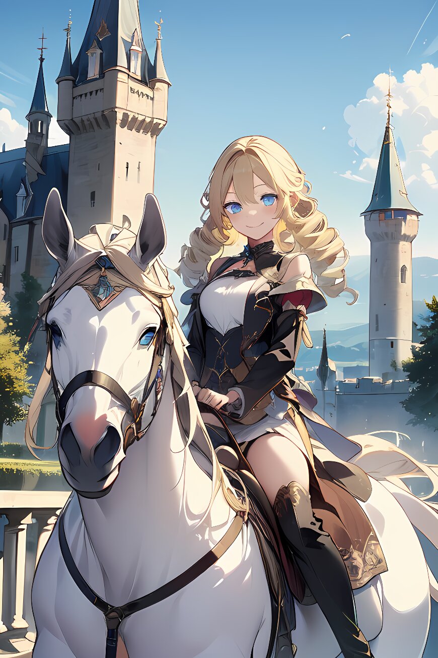 1 lady, blue eyes, spiral curls, blonde hair, smile, smugness, (riding on horse, castle on background),Art Style 2.0