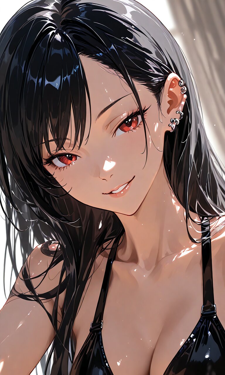 1 girl, seductive smile, red eyes, long hair, black hair, (pierced ear, wink),