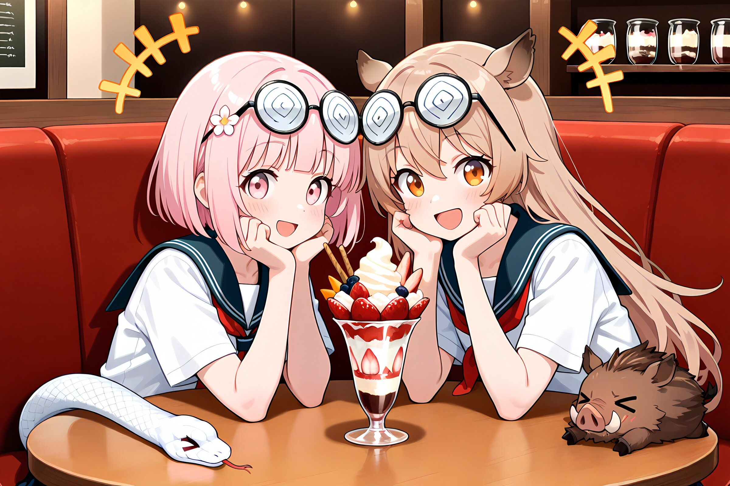 2 little girls, solo, symmetrical pose, masterpiece, best quality, amazing quality, very aesthetic, light pink hair, light pink eyes, loose wavy hairstyle,short bob cut,floral hair accessory, happy smile, open mouth, cheerful, notice lines, +++, serafuku, coke-bottle glasses, eyewear on head, white snake, > <, sitting, parfait,cafe, BREAK 2 little girls, solo, symmetrical pose, masterpiece, best quality, amazing quality, very aesthetic, light brown hair, long hair, amber eyes, (wild boar's ears:1.2), happy smile, open mouth, cheerful, notice lines, +++, serafuku, coke-bottle glasses, eyewear on head, wild boar, >_<, sitting, parfait,cafe,