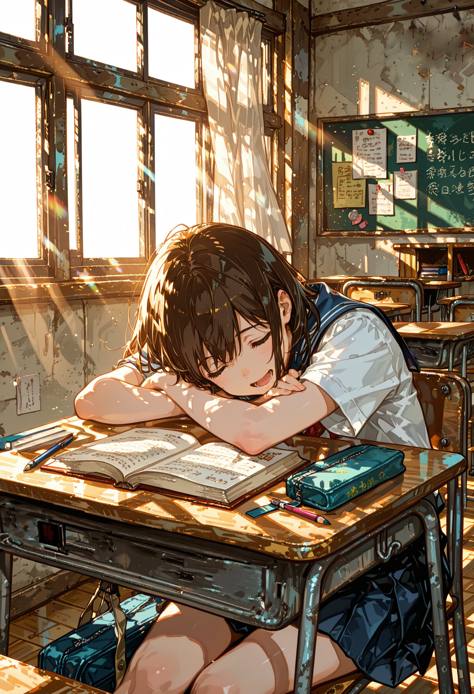 1girl, solo, school_uniform, classroom, sitting, at_desk, head_on_desk, laying_on_arms, asleep, own_desk, open_book, notebook, stationery, pencil_case, tired, melancholic, background_students, chatting, laughing, emotional, warm_sunlight, light_through_window, school_life, cinematic_lighting, afternoon, depth_of_field, isolation, A front-facing school desk with no visible storage underneath. A girl is sitting and sleeping on her own desk, her head resting on her arms above an open textbook and some notes. The camera angle is slightly from the side, capturing the stillness of her posture while the background shows lively classmates chatting and playing in the softly lit classroom. Warm sunlight pours through the window, reinforcing the quiet isolation of the girl amidst the bright, cheerful surroundings.