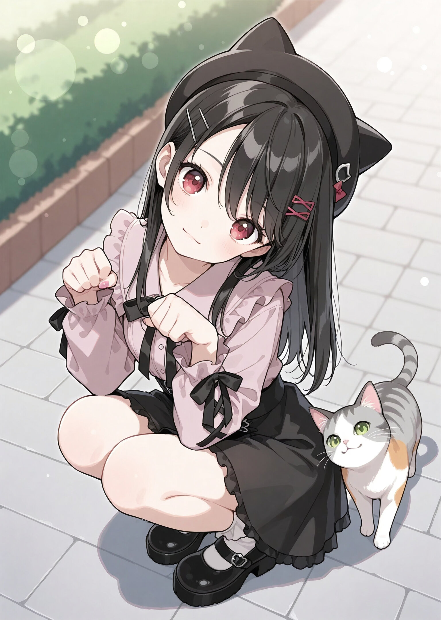 (flat color:0.1),(pale color:0.1), (tareme:0.33), cute 1girl , ruby eyes, straight hair ,black hair ,bangs between eyes,swept bangs, hairpin,kawaii, (pastel theme :0.1), (depth of field:1.1), (bokeh:0.9),happy, (head tilt:1.3), BREAK (cats ,paws up :1.1),(playful cat:1.3),cat, hands up, paw pose, ribbon, jirai kei, full body, squatting, refined ,headwear, outdoors,(contrapposto:0.2),from above, (from side:0.1), nail polish