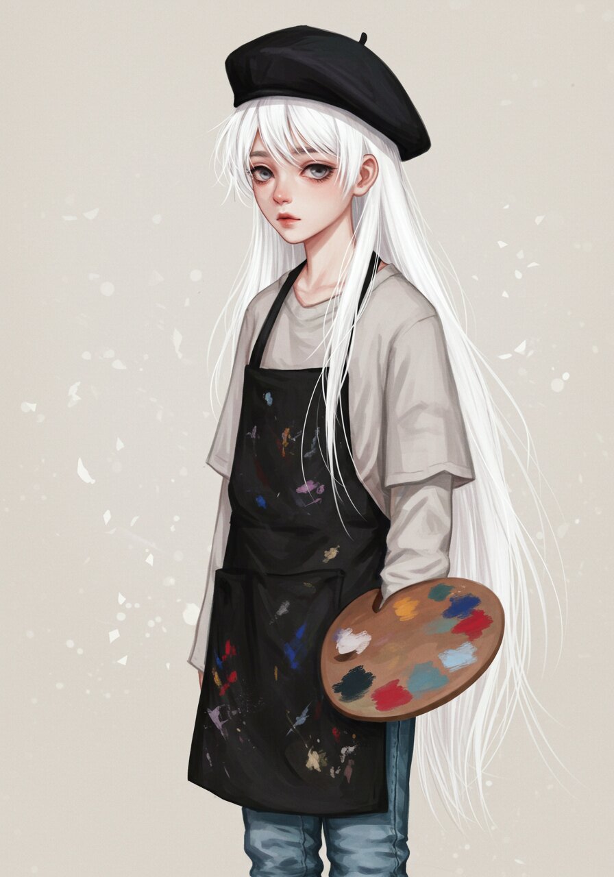 A realistic illustration of a young boy with long, white hair that reaches down to his waist. He has soft, pale gray eyes and a faint, melancholic expression. He wears a black beret tilted slightly to one side, adding an artistic charm to his appearance. Over a simple shirt, he wears a black painter’s apron, slightly smudged with traces of paint, and faded blue jeans. His posture is gentle and unassuming, as if lost in thought. The overall color palette is soft and desaturated, with a delicate, ephemeral atmosphere. The lighting is natural and subdued, enhancing the fragile and dreamy mood of the scene.