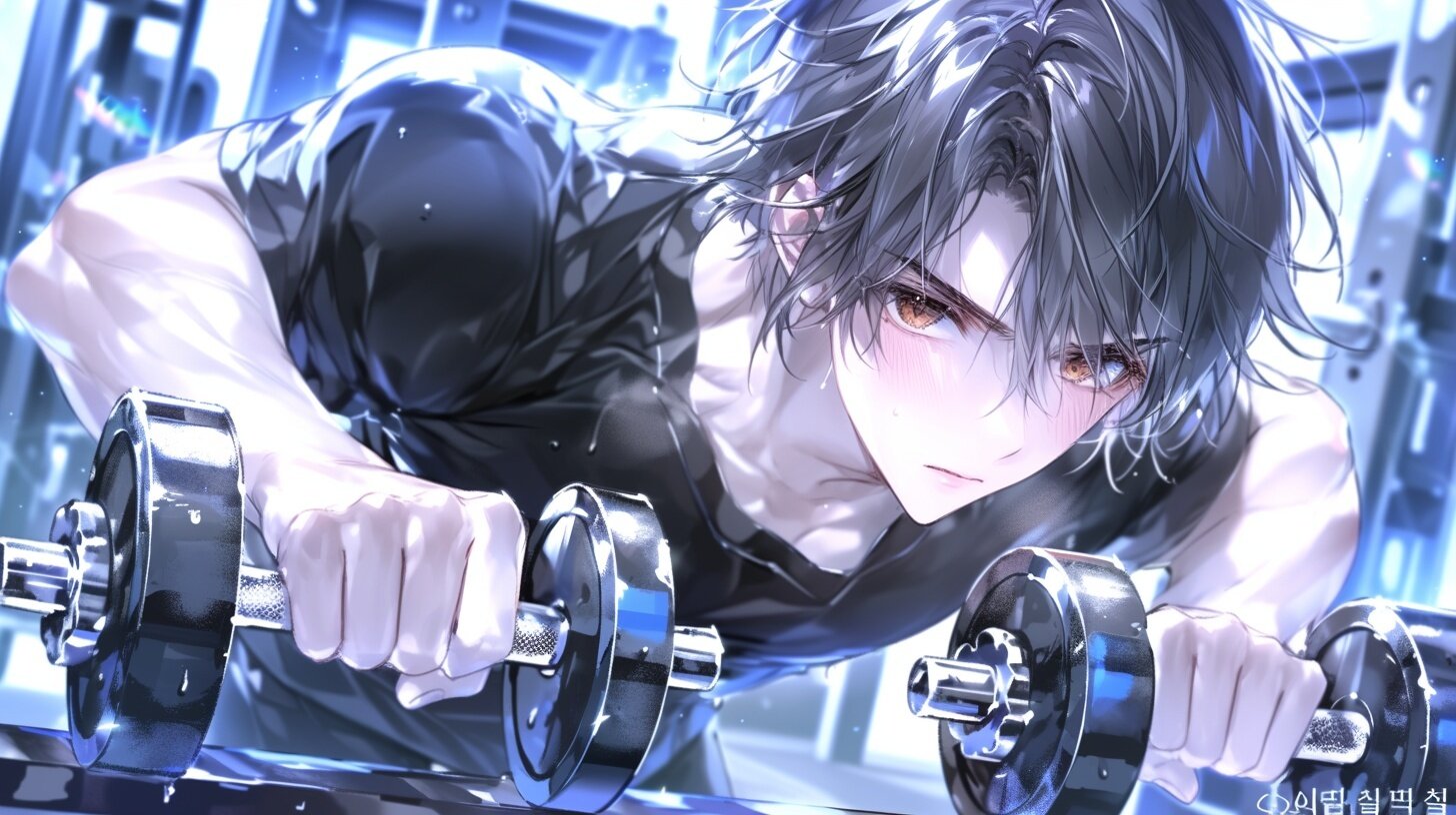 anime style, A handsome young man with black hair doing weight training, doing push-ups with one hand and reaching behind his back with the other. --no sweat