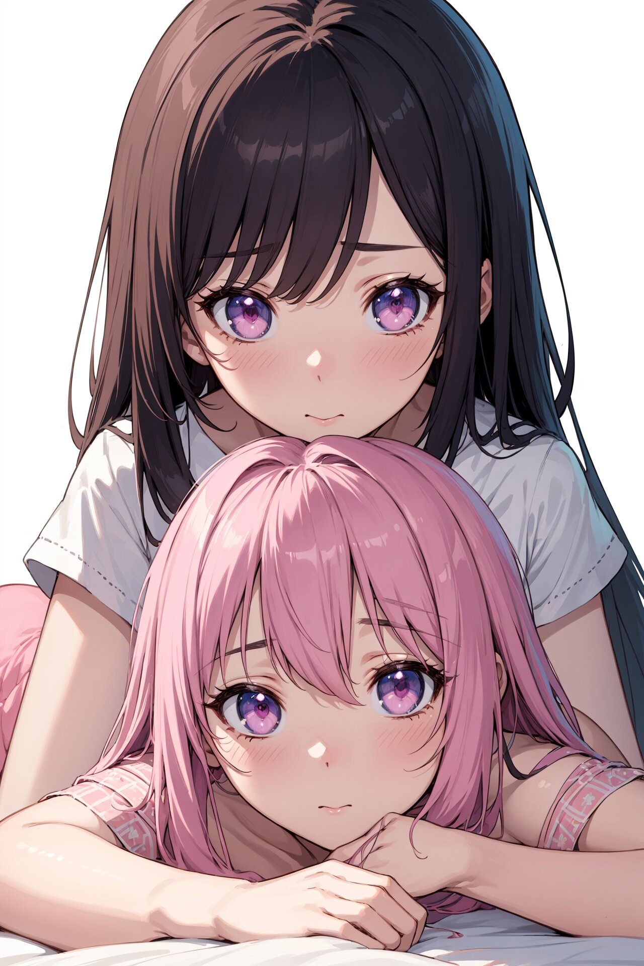 ((masterpiece)), ((high resolution)), ((best quality)), (ultra-detailed), anime, ((kawaii)), cute, (lovely), ((extremely detailed)), best quality, dynamic angle, (beautiful), 2girls, (loli), yuri, mesugaki, lesbian couple, pink bed, intense, fingering, squirt, pleasure, erotic,