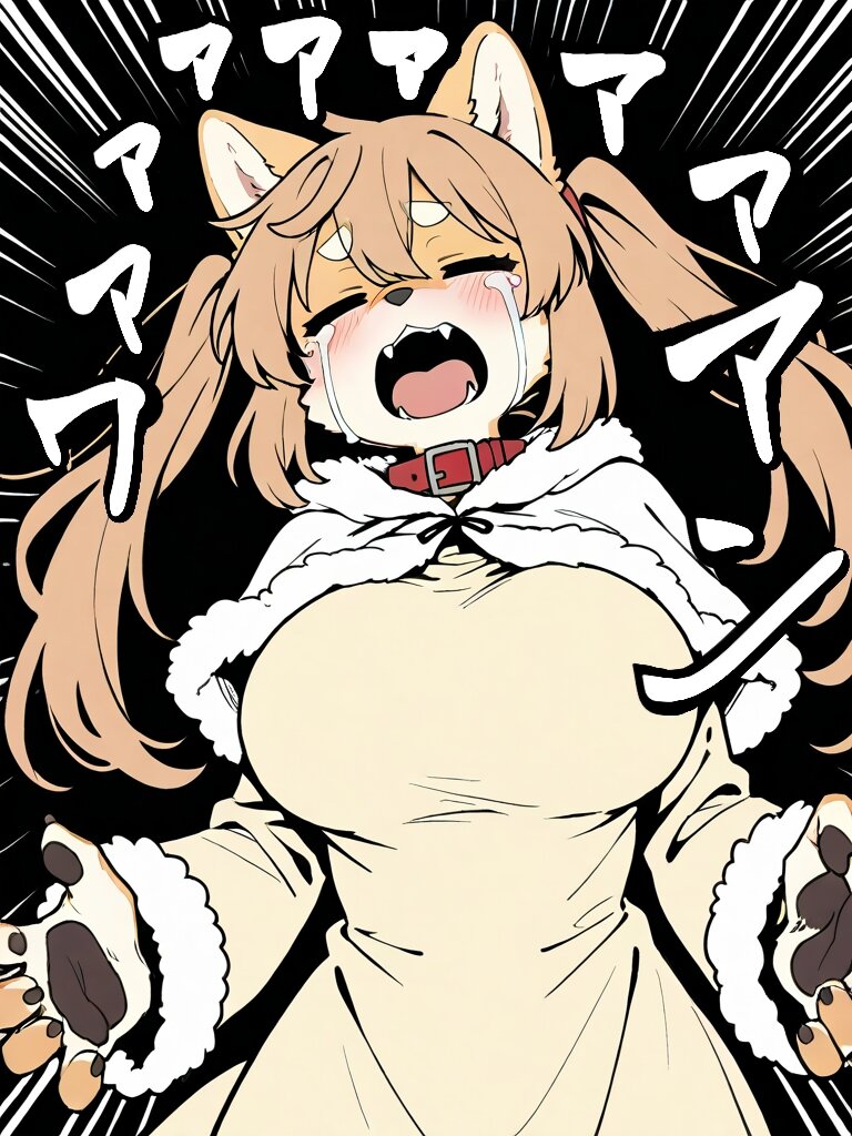 1girl,(loli),((short height)),short female,oppai loli,(dog girl),(shiba-inu girl),(furry female),(dog snout:1.3),shiba-inu ears,body fur,(large breasts),light-brown hair,long hair,long twintails,white thick eyebrows,hair between eyes,=_=,closed eyes,streaming tears,drooping dog ears,animal collar,fur-trimmed capelet,white capelet,fluffy dress,yellow dress,long sleeves,toweling dress,fur-trimmed dress,medium dress,big mouth,fangs,cropped shoulders,motion lines,motion trails,motion blur,barking,woofing,emphasis lines,black background,hair shade,from front,foreshortening,perspective,saturated,smooth,dynamic angle,looking ahead,howling,facing up,simple background,(cute),((high contrast)),(anime colored),(kawaii),softy,(2D),(cute),furry,(two tone fur),(furry body),detailed face,high quality,cute clothes,animal ears,solo,masterpiece,anime,flat color style, simple coloring style,((correct_anatomy)),flat color style, simple coloring style,gddw