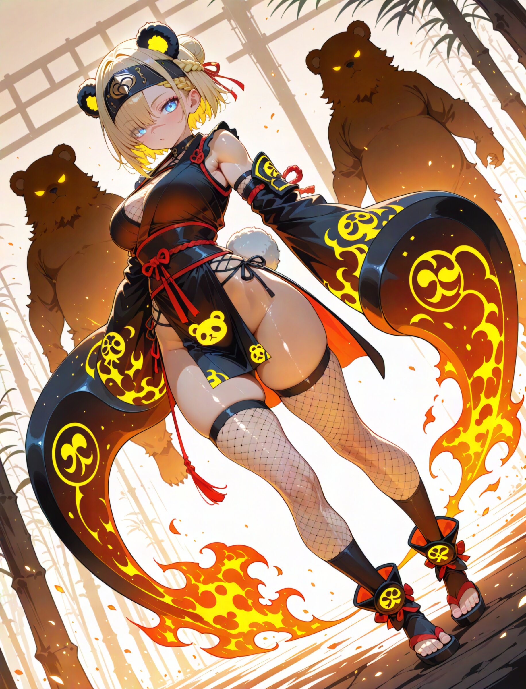 super fine concept art, hard surface, 8K, masterpiece, best quality, amazing quality, very aesthetic, absurdres, pinhole lens, focus crotch , (dutch angle:1.2), The silhouette is composed of dynamic, Bear print and vibrant rhombus. The background is a solid, creating a striking contrast with the intricate, multi-colored design of the character, summer atmosphere. glowing bear energy, beige silhouette of serious bear guardian, huge bear aura, 1girl, samurai, (muscular female:0.65), blonde hair, hotpink colored inner hair, short hair, bun with braided base,braided bangs , fine hair, ,, beautiful blue eyes framed breasts, scar on nose, ,, ,, ninja cloth, short kimono, obijime, fishnet inner, fishnets, fishnet thighhighs, pelvic curtain,, kote, (ninjutsu:1.1), (holding scroll:1.1) half mask, forehead protector,, revealing clothes, zouri, , bear ears, bear tail, ,, japanese clothes, seductive smile, dynamic pose, kung fu attack, kung fu action, kuji-in, ninjutsu, floating weapon, tantou, katon, fire, embers, cremate (swirling ink effects:1.2) fleeing, The background is a solid, bright beige, creating a striking contrast with the intricate, multi-colored design of the character, (standing silhouette:1.0), pop color background, (high saturation:1.2), summer coloring, partly black ink wash effect, professional art lots of details, , overexposure, sumie effect style, 4ur4_illu,shiny, glowing, glowing particles, glowing light particles, light particles, flame beige, <lora:noline (1):-0.5> <lora:sdxl2-flat2-512b:0.15> <lora:facelightup_xl_v10:0.5> <lora:V2_yakumo_alchemy:0.5> <lora:Aura_illu:1.0>