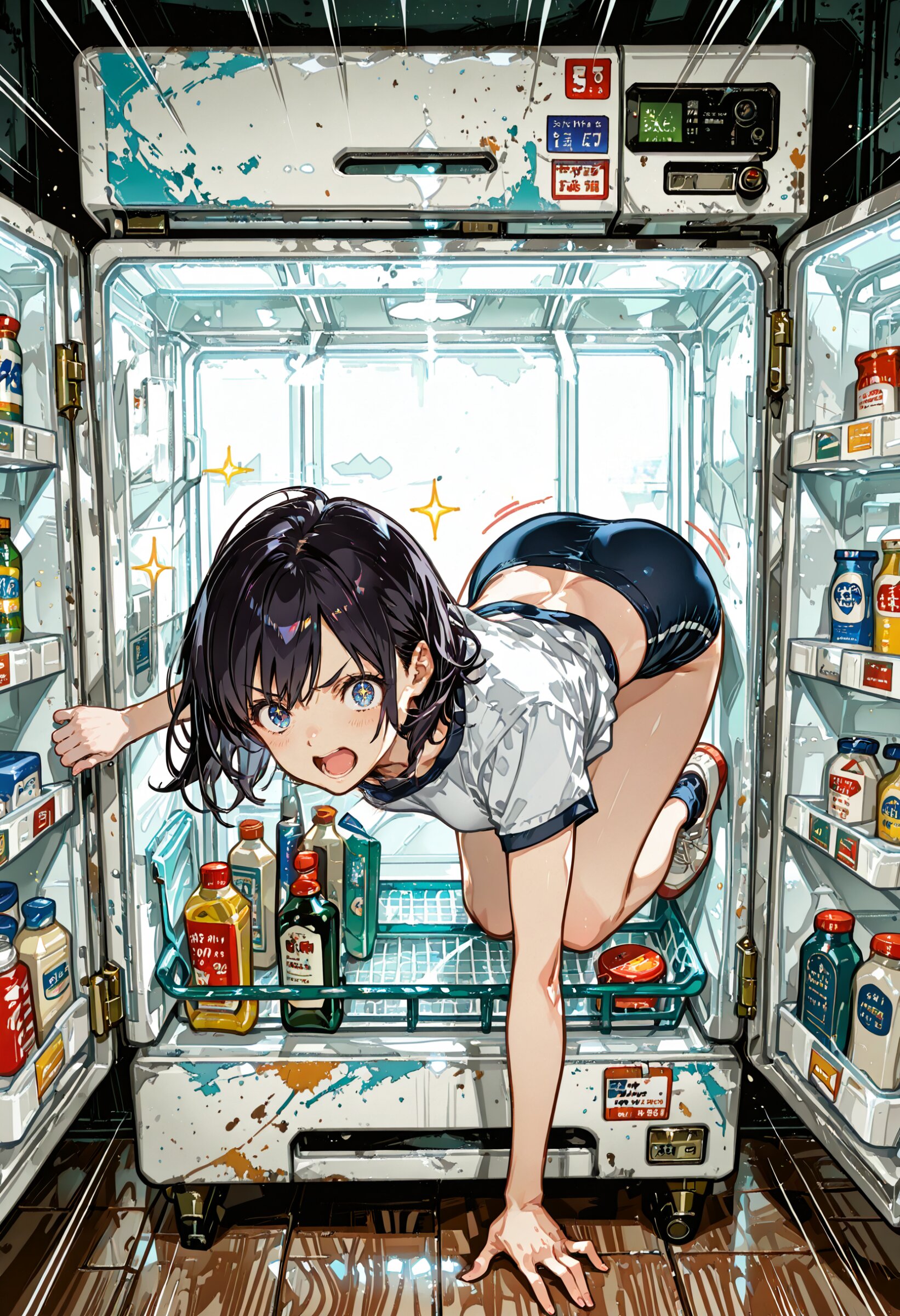 1girl, solo, open_refrigerator, inside_refrigerator, crawling_out, bursting_out, from_inside, from_appliance, fridge_interior, dramatic_entry, excited_expression, exaggerated_motion, comic_style, speed_lines, sparkle_effect, motion_blur, action_lines, over_effects, energetic_pose, , absurd_situation, full_body, standing, The girl is joyfully bursting out from the interior of a refrigerator, clearly shown to have been inside. Her upper body is out, while her legs are still inside the fridge, adding comedic impact. The open fridge door and visible inner shelves confirm her origin. Radiating speed lines, sparkle effects, and exaggerated manga-style motion intensify the humor.