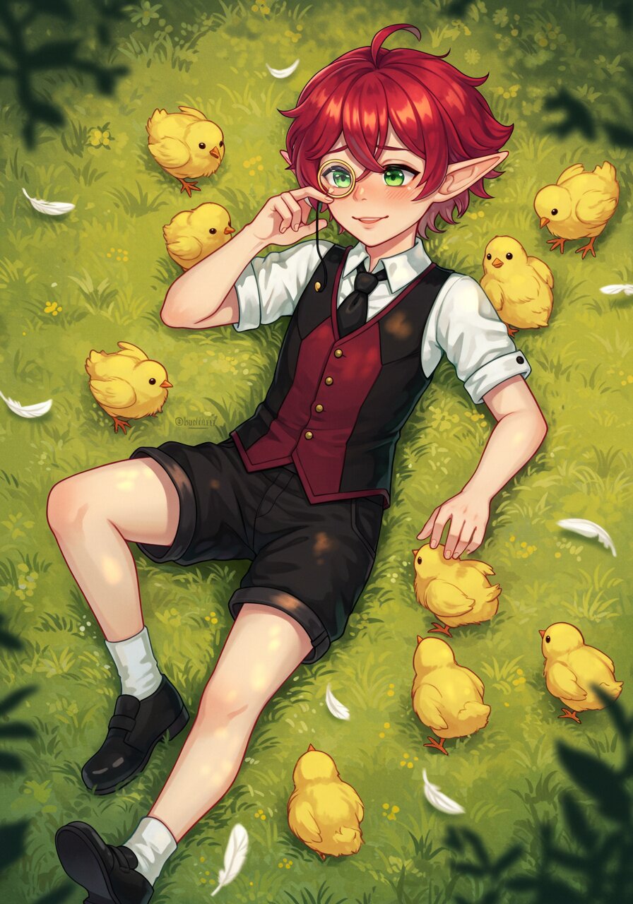 A young, elf-eared boy with fluffy, vibrant red hair styled similarly to Ragatha from "The Amazing Digital Circus". His left eye is covered with a monocle. He has gentle green eyes and a shy, innocent-looking face, now softened by a warm, content smile. He wears a short-sleeved white shirt with a black necktie, and a fitted vest with a black front panel and dark red (maroon) side panels. He also wears black shorts with the cuffs rolled up to reveal white lining. His outfit is completed with white socks and black shoes. He is lying down on his stomach in a relaxed pose, legs bent at the knees with his feet slightly lifted in the air. Around him are several fluffy yellow chicks, peeping softly and pecking curiously at his fingers or shoes. He gently reaches out to one of the chicks with a delicate touch, his expression filled with quiet delight and innocent wonder. The setting is serene—perhaps a grassy field, sun-dappled and warm, with a sense of peace and stillness in the air. Full body, lying pose. The art style is semi-realistic anime, with soft lighting, gentle shading, and detailed rendering of fabric and feather textures.