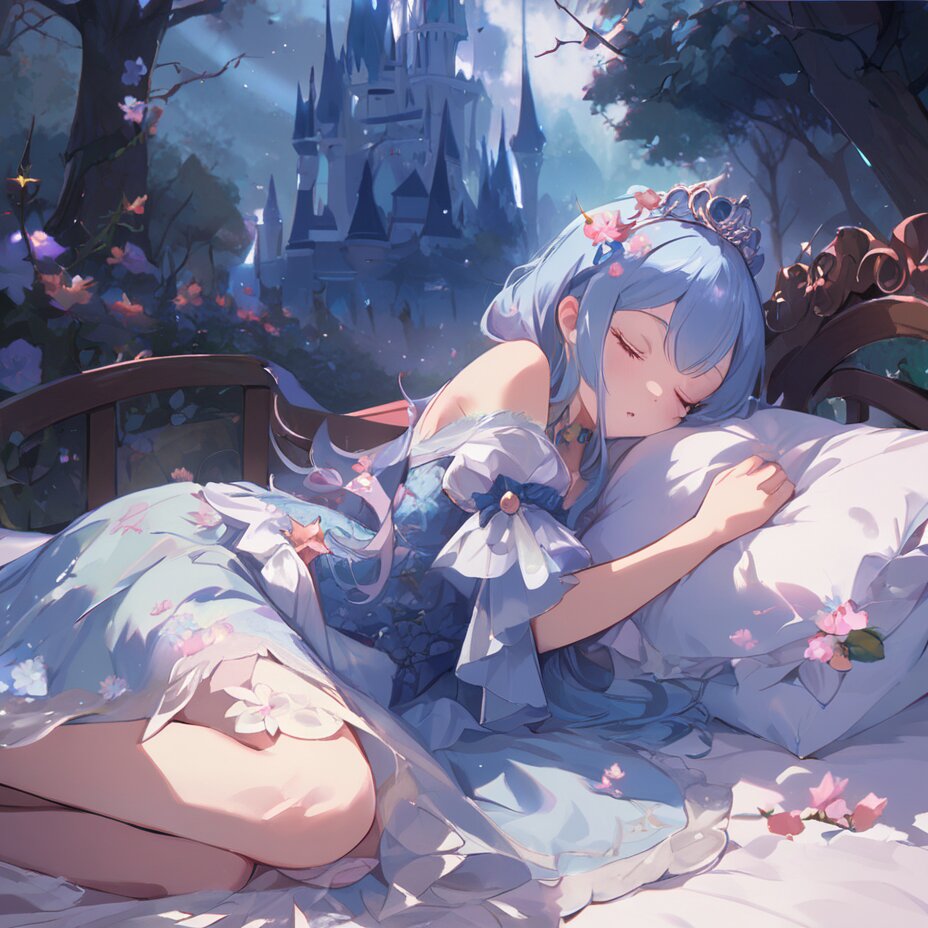masterpiece, best quality, 1girl, kawaii, princess, dress, tiara, sleeping beauty, head on pillow, sleeping on bed, outdoor, castle in woods, castle covered with thorns, multiple beautiful thorn flowers, aurora (sleeping beauty), disney