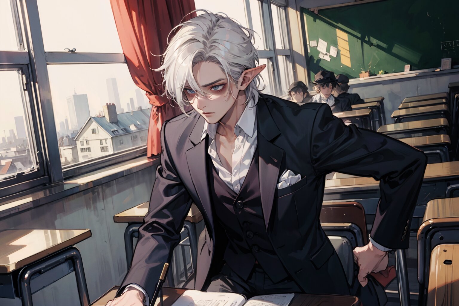 no human,absurdres,detailed and intricate, (best quality),solo,,super beautiful,extremely detailed, BREAK,(elf:1.1),(1 boy),mature male,male face,male eyebrows, male eyes,demi-human,downer,dark, BREAK,white hair,hair over one eye,messy hair,long hair, BREAK,maleblazer, school uniform,student,pants,gothic fashion,dress shirt,blazer,schoo,classroom,