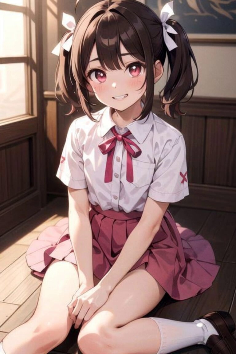 Wearing a white collared shirt with ribbon, a large pink ribbon, a dark pleated miniskirt, (exposed dark pleated miniskirt: 0.6), white loose socks with ribbon, (small pink ribbon decoration on socks), brown loafers, summer, short sleeves,high twintails、best quality, masterpiece, photorealistic, realistic, ultra high definition, ray tracung、1girl、solo、(((loli0.5)))、 blurry background、dark brown hair、short hair、ahoge、evil grin、Red eyes、bangs pinned back、slant eyes、sparkling pupils、cosmetics、cherry pink lip、