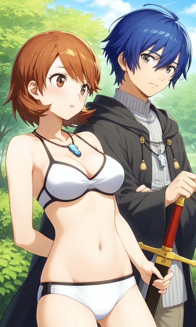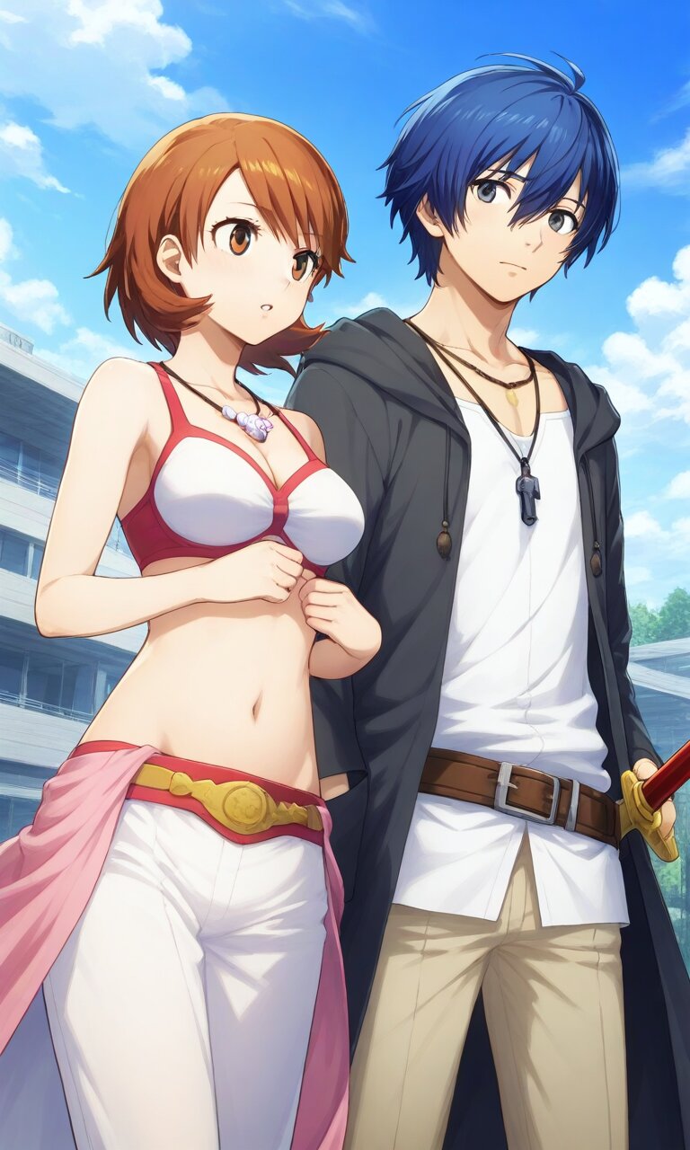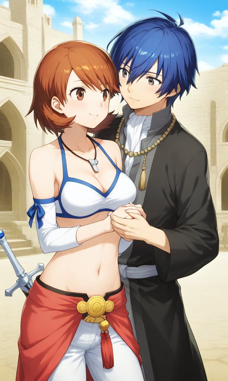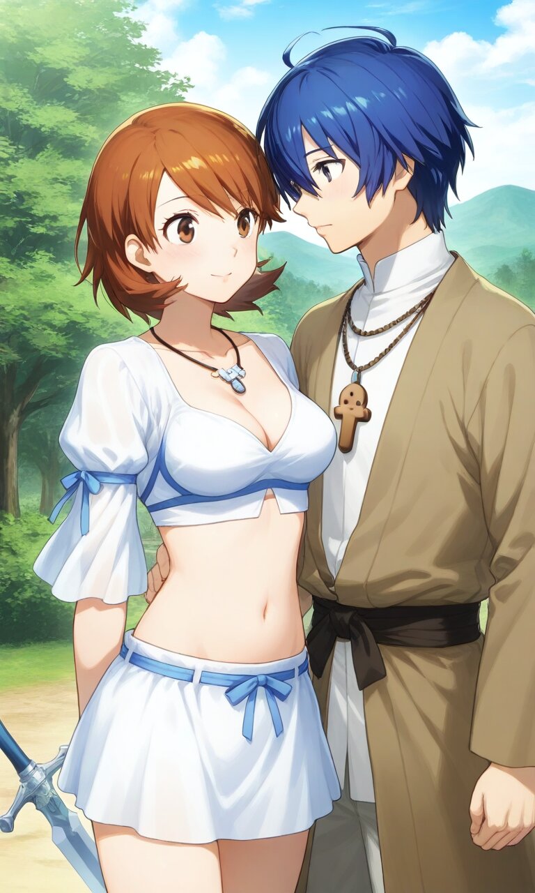 Couple, boy and girl, two people only,absurdres, ultra-detailed, master piece, high resolution, 8k, Boy, girl, couple, Couple, boy and girl, two people only,absurdres, ultra-detailed, master piece, high resolution, 8k, Boy, girl, couple, A Kofun-era couple standing proudly near a massive keyhole-shaped kofun tomb under construction. The man, a warrior, holds a bronze sword, while the woman wears an elaborate beaded necklace and a flowing robe. Workers in the background move earth and stones, with haniwa clay figures lining the tomb’s edges under a cloudy sky BREAK the boy(yuuki makoto, blue hair, gray eyes, 1 boy , ) BREAK the girl(yukari takeba, short hair, light brown hair, brown eyes, large breaths,Cleavage, navel)