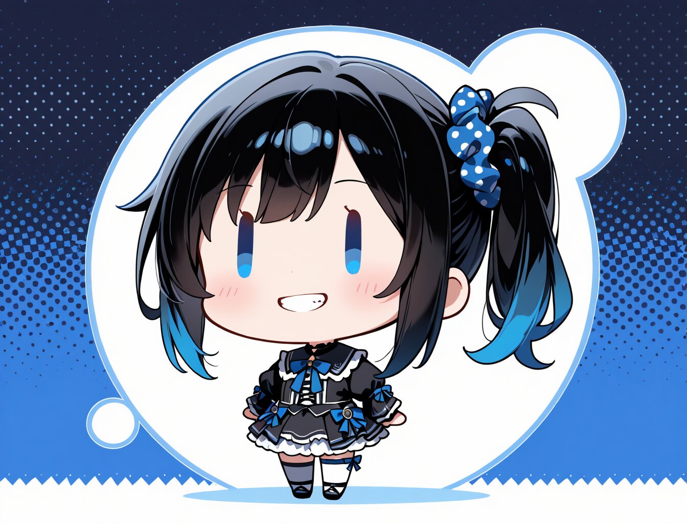 masterpiece,best quality,ultra detailed,black hair,blue tips,(Side ponytail:1.2),blue eyes,blue bow,blue_scrunchie,grin, BREAK chibi,full body,| |,comic,abstract_background,polka_dot,blue and white,gothic_lolita,